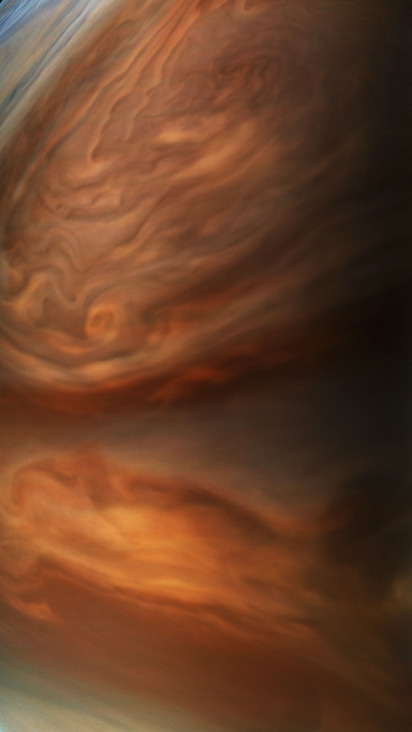 Junocam pixels are 12 bits deep from the camera but are converted to 8 bits inside the instrument using a lossless "companding" table, a process similar to gamma correction, to reduce their size. All Junocam products on the missionjuno website are in this 8-bit form as received on Earth. Scientific users interested in radiometric analysis should use the "RDR" data products archived with the Planetary Data System, which have been converted back to a linear 12-bit scale.