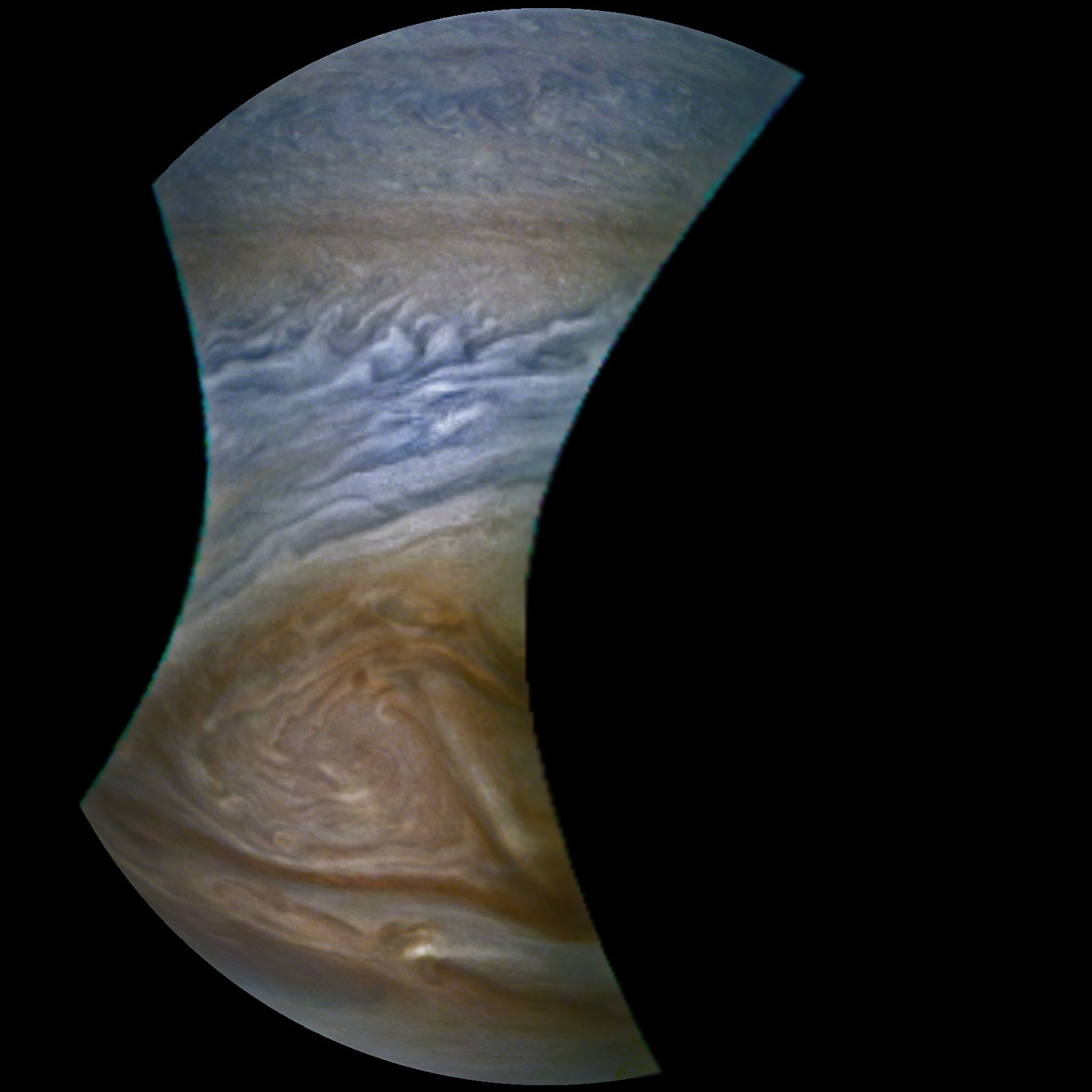 Junocam pixels are 12 bits deep from the camera but are converted to 8 bits inside the instrument using a lossless "companding" table, a process similar to gamma correction, to reduce their size. All Junocam products on the missionjuno website are in this 8-bit form as received on Earth. Scientific users interested in radiometric analysis should use the "RDR" data products archived with the Planetary Data System, which have been converted back to a linear 12-bit scale.