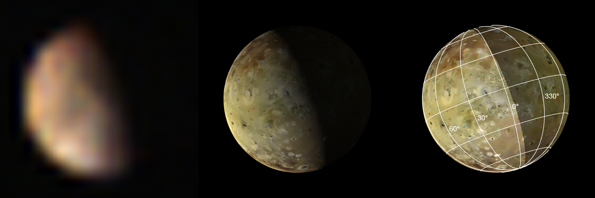 An enlarged and slightly enhanced view (left) of Io from image PJ16_23. Despite the very low resolution (about 300 km/pixel in the original image data), hints of some large scale surface markings are visible. For context, two computer generated views are also shown (center and right).