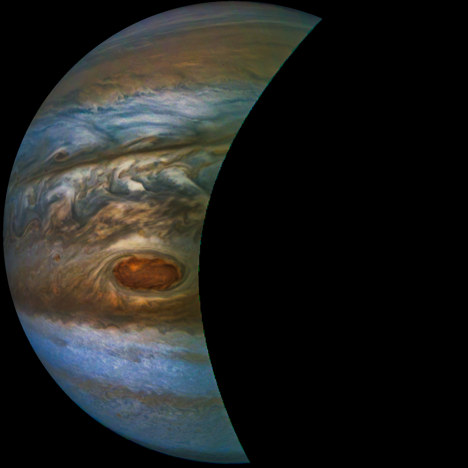 I enhanced this image to discover the awesome blue and rust belts of Jupiter with the red dotted storm.