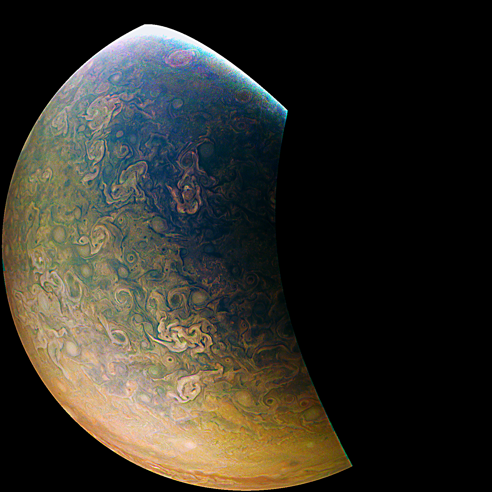 Junocam pixels are 12 bits deep from the camera but are converted to 8 bits inside the instrument using a lossless "companding" table, a process similar to gamma correction, to reduce their size. All Junocam products on the missionjuno website are in this 8-bit form as received on Earth. Scientific users interested in radiometric analysis should use the "RDR" data products archived with the Planetary Data System, which have been converted back to a linear 12-bit scale.