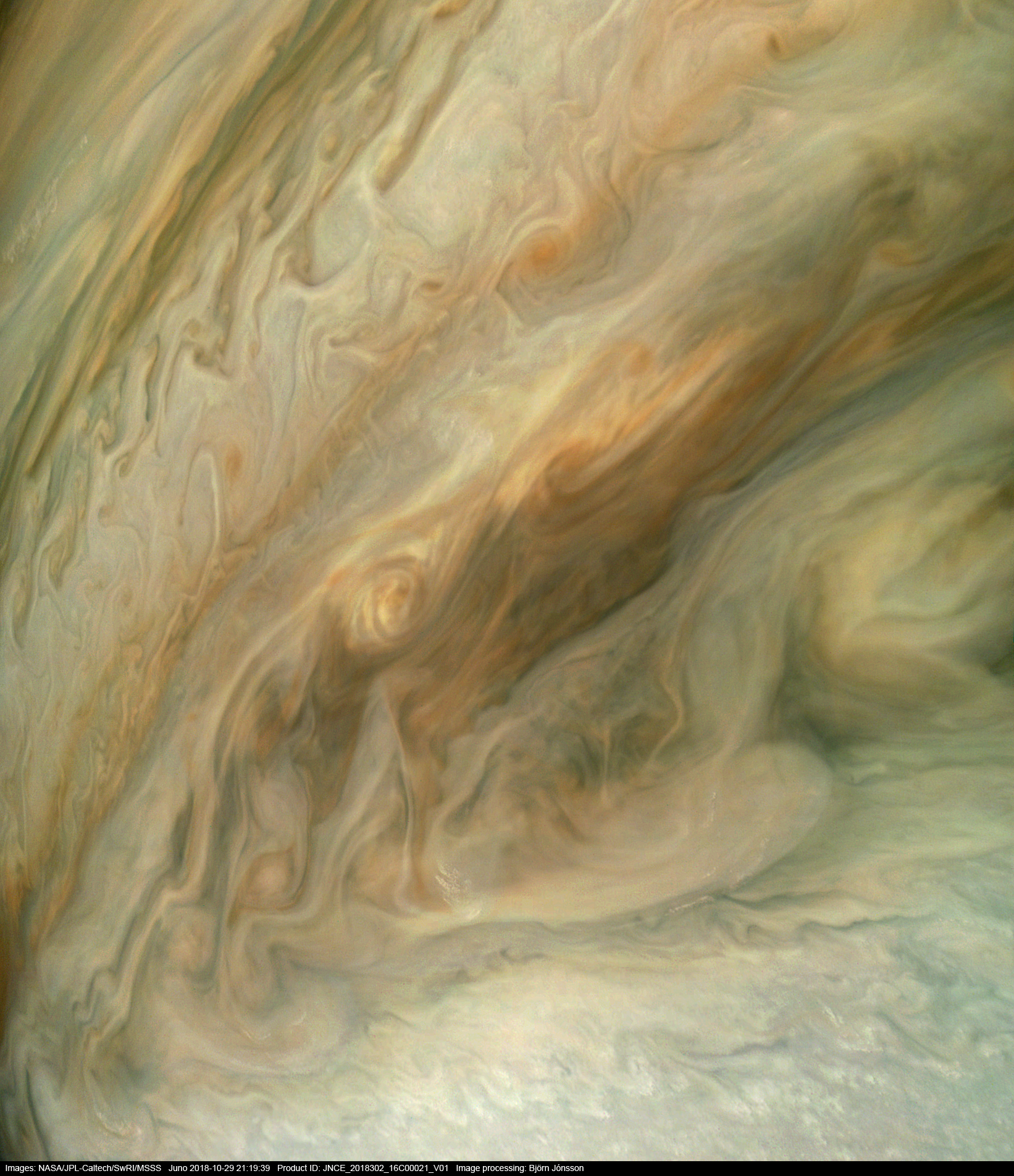 An image processed from the PJ16_21 raw image framelets. The contrast/color has been exaggerated and small scale features sharpened. An interesting feature in this image is the subtle orange band that extents diagonally across the image from just left of the upper right corner to a bit above the lower left corner. This looks like a layer of thin high altitude orange/red haze through which cloud features farther down are visible.