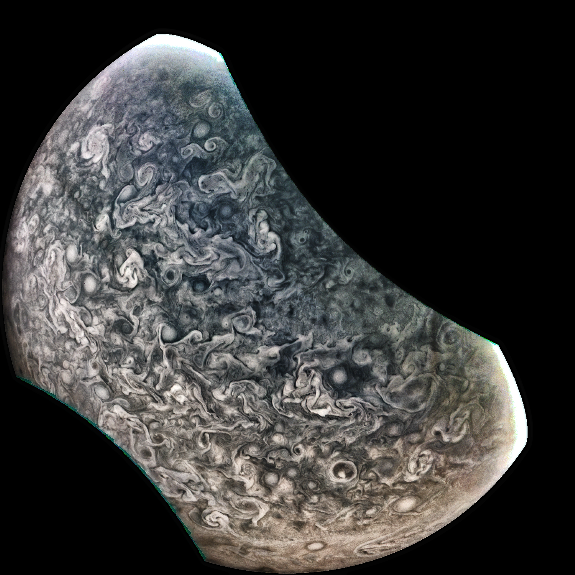Junocam pixels are 12 bits deep from the camera but are converted to 8 bits inside the instrument using a lossless "companding" table, a process similar to gamma correction, to reduce their size. All Junocam products on the missionjuno website are in this 8-bit form as received on Earth. Scientific users interested in radiometric analysis should use the "RDR" data products archived with the Planetary Data System, which have been converted back to a linear 12-bit scale.