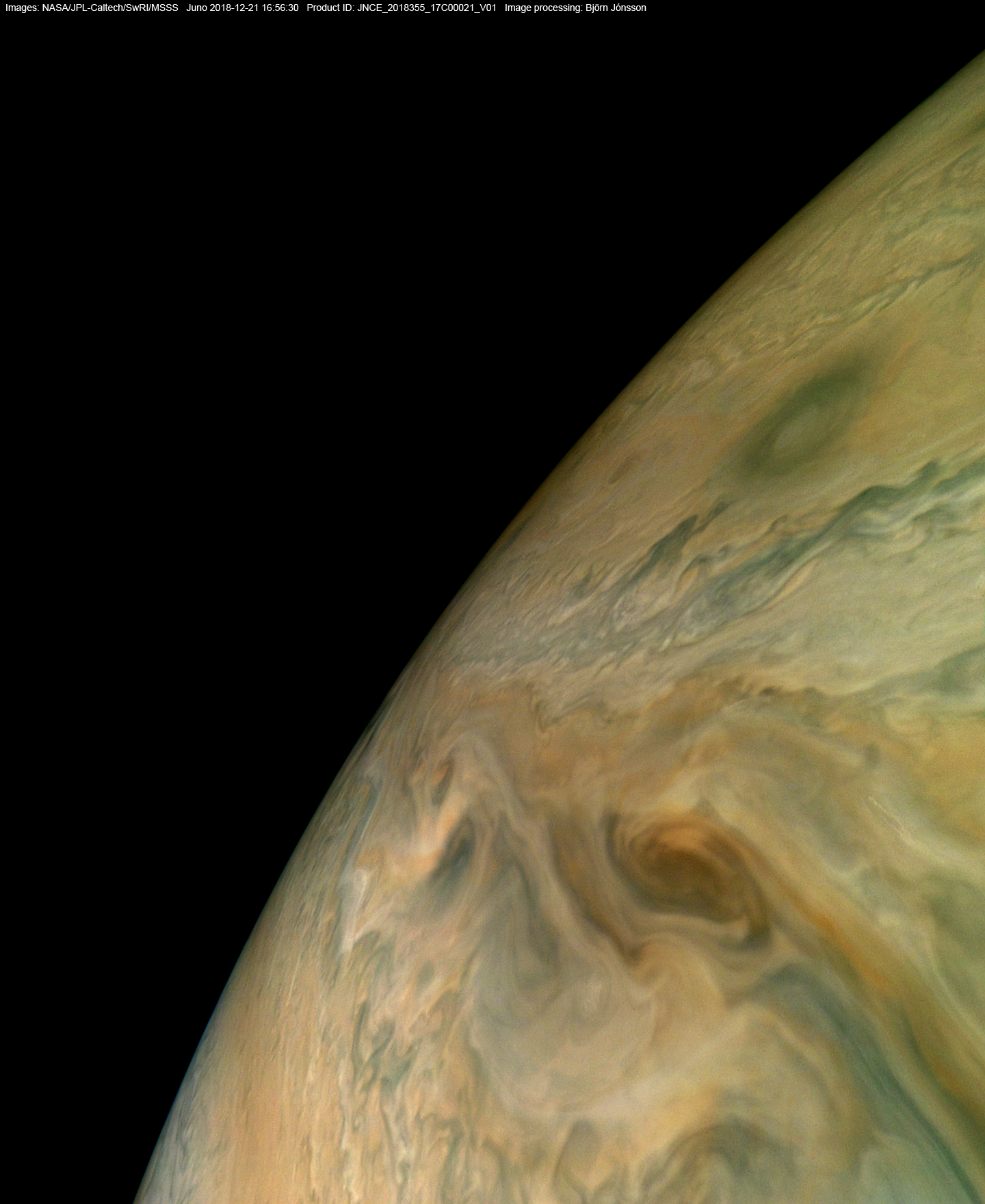 An image processed from the PJ17_21 raw image framelets. The contrast/color has been exaggerated and small scale features sharpened.