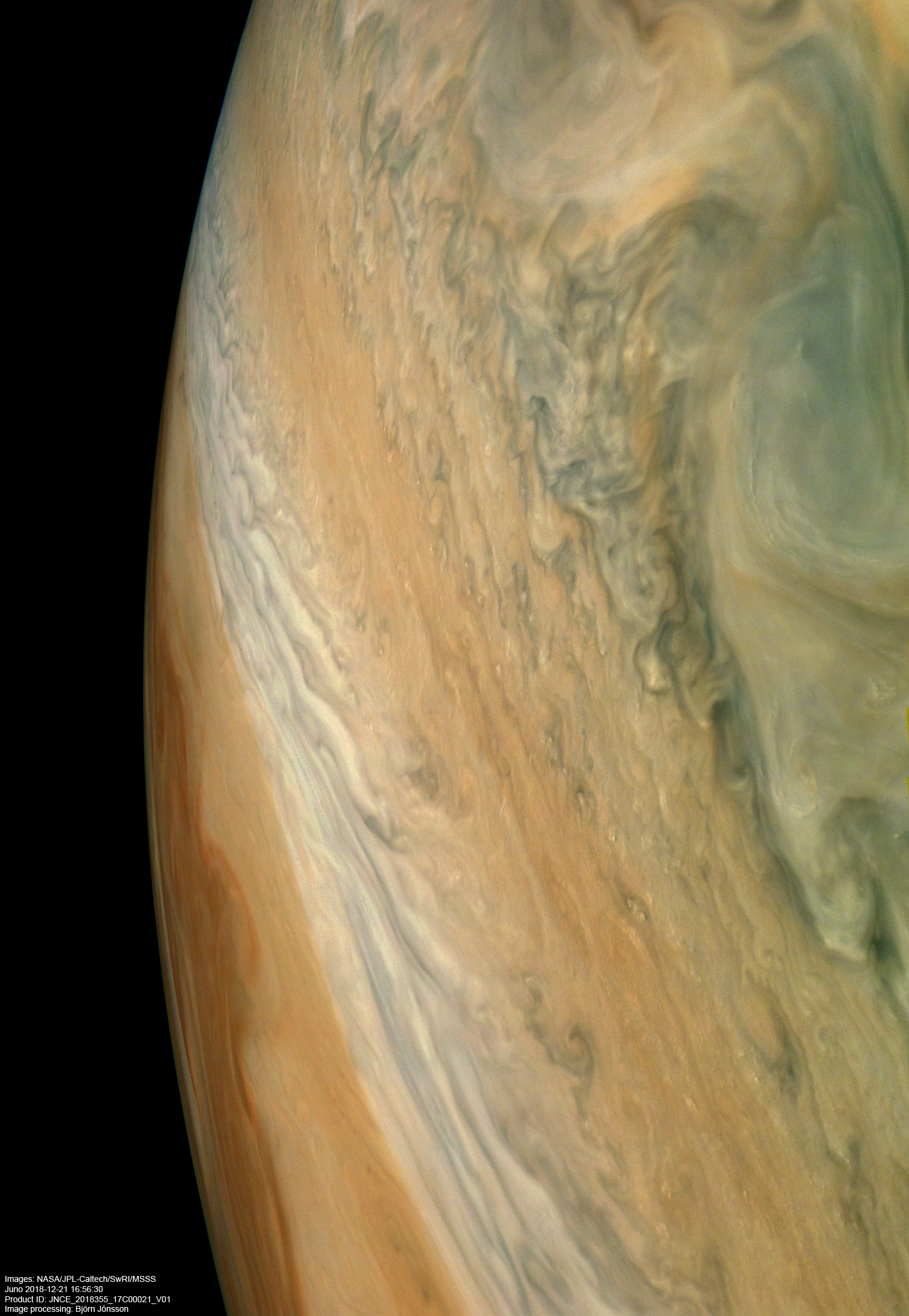 An image processed from the PJ17_21 raw image framelets. The contrast/color has been exaggerated and small scale features sharpened.