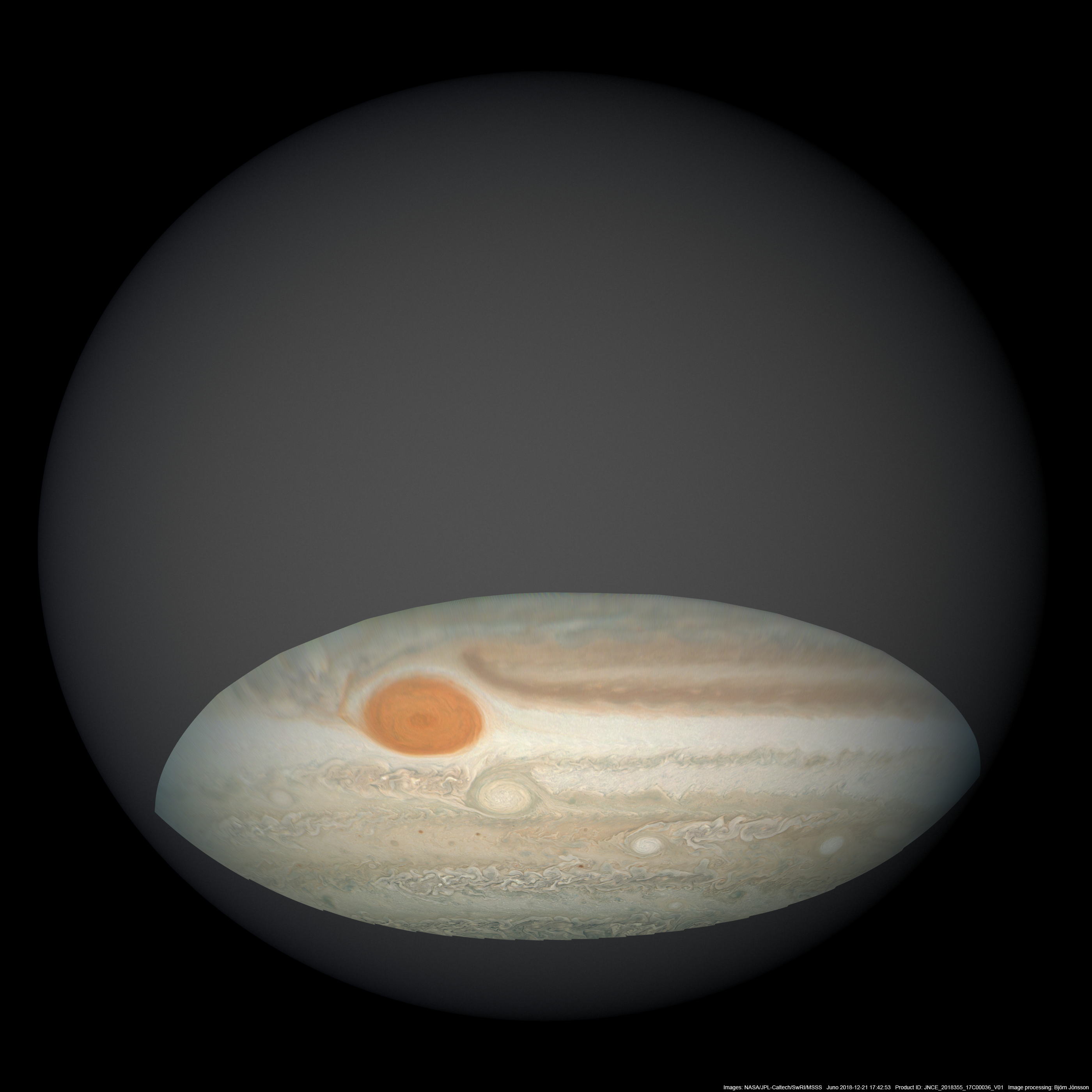 In this approximately true color/contrast image, JunoCam image PJ17_36 has been reprojected to simulate an Earth-based view. To show Jupiter's entire globe, a dark gray color has been used in areas not covered by the original imaging data.