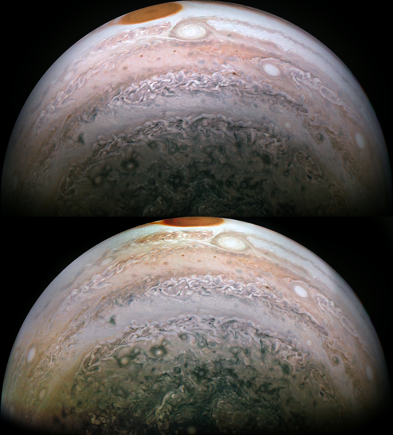 The JunoCam images are identified by a small spacecraft icon. You will see both raw and processed versions of the images as they become available. The JunoCam movie posts have too many images to post individually, so we are making them available for download in batches as zip files.