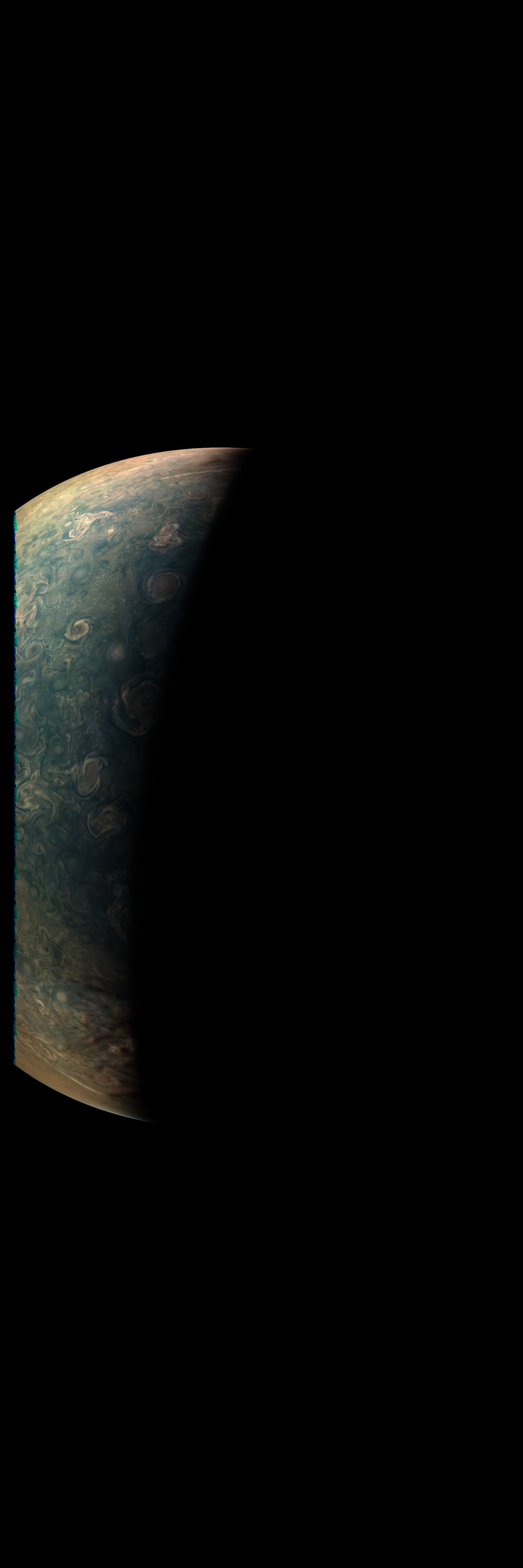 Resolution is 30 pixels per degrees in an equidistant cylindrical system centered to the camera at image stop time, with an axis parallel to Juno's spin axis. The rendered field of view is 60x180 degrees.