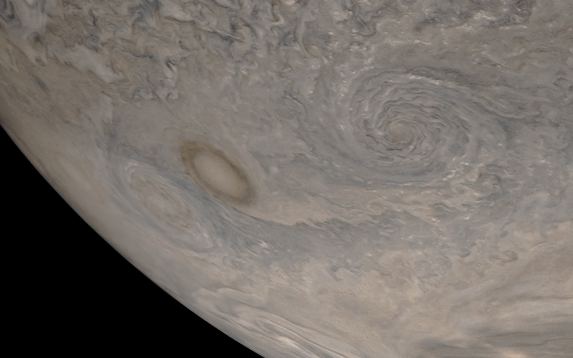 Enlarged and sharpened image of two cyclones in Jupiter's north polar region. These two cyclones are separated by an anticyclonic brown oval. The cyclones may be at different stages of evolution. The right cyclone has distinctive cloud bands with bright convective clouds within them. The left cyclone appears to have less distinctive cloud bands and fewer bright clouds. It also appears to have developed concentric color bands.