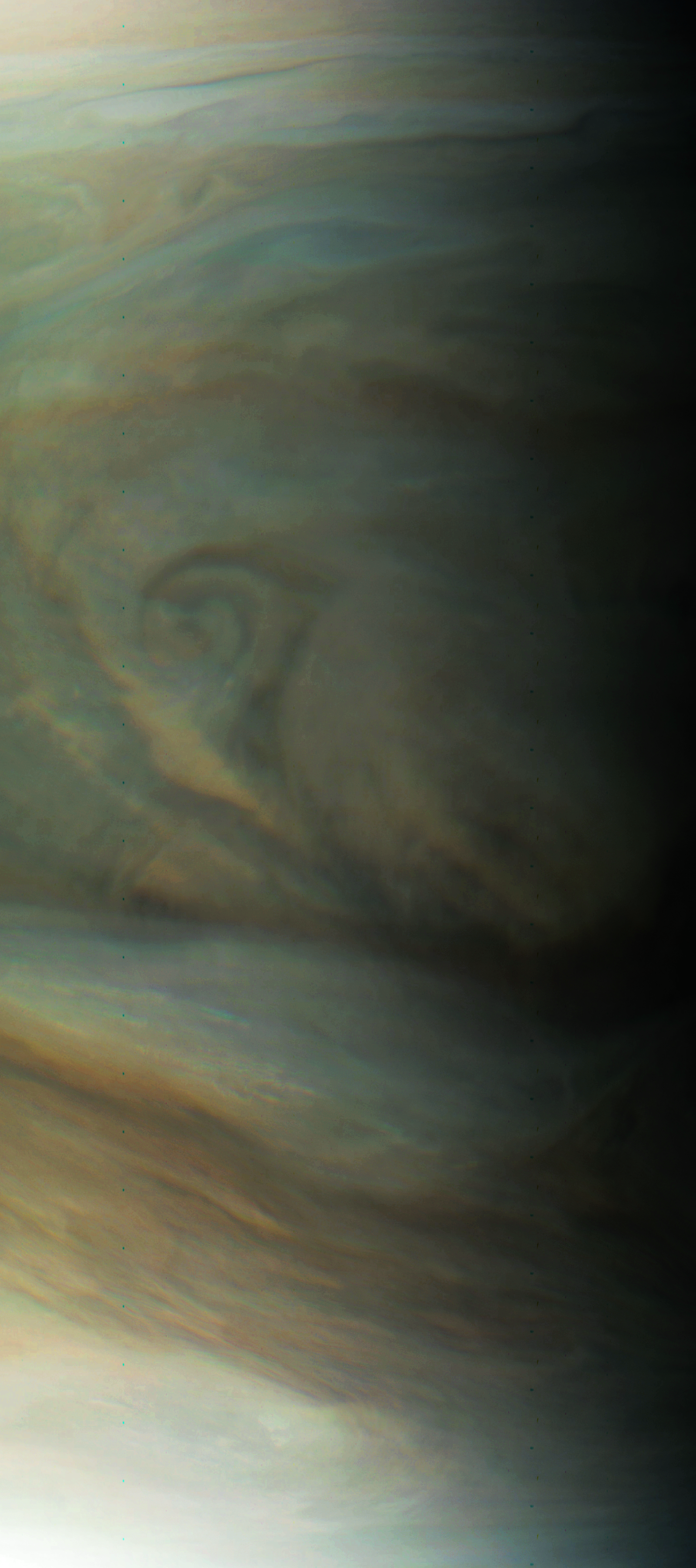 The image is derived from raw perijove 04 image #103. Especially in the lower half of the image, the cloud features look fibered, remotely reminiscent of cirrus clouds on Earth. Color correlates to the structure of the clouds.