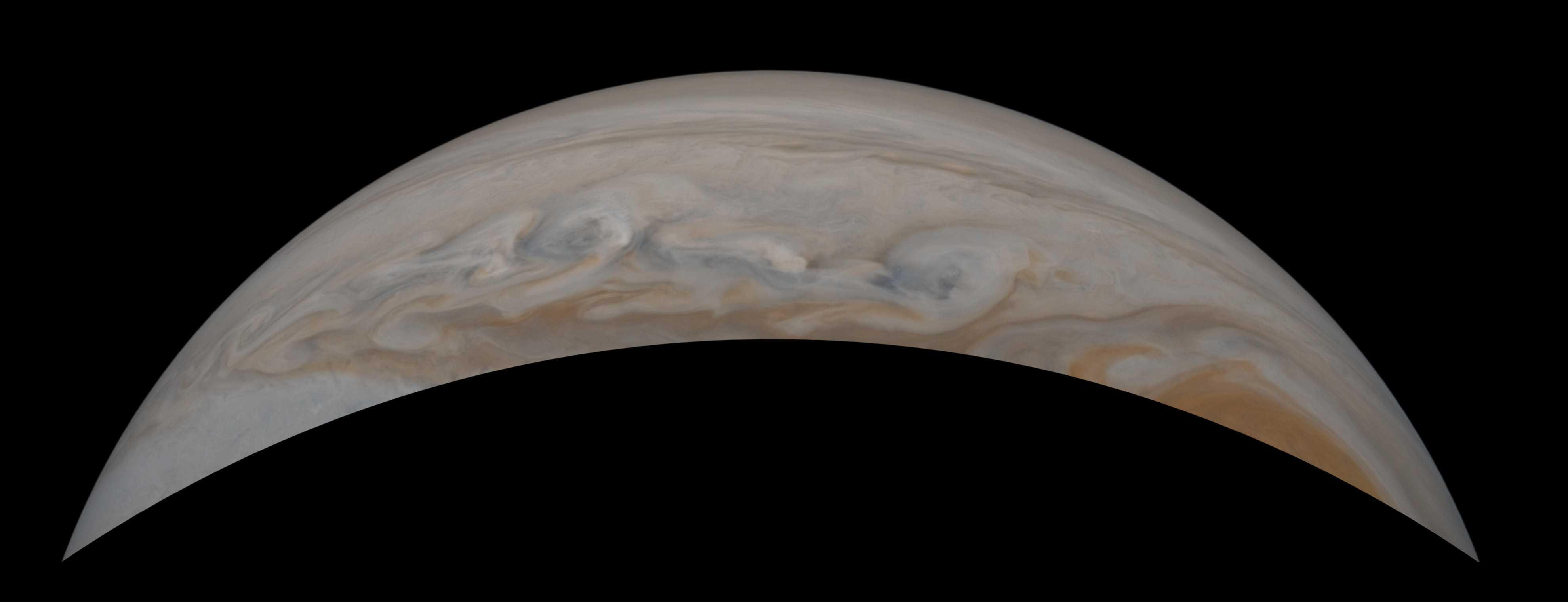 Junocam pixels are 12 bits deep from the camera but are converted to 8 bits inside the instrument using a lossless "companding" table, a process similar to gamma correction, to reduce their size. All Junocam products on the missionjuno website are in this 8-bit form as received on Earth. Scientific users interested in radiometric analysis should use the "RDR" data products archived with the Planetary Data System, which have been converted back to a linear 12-bit scale.