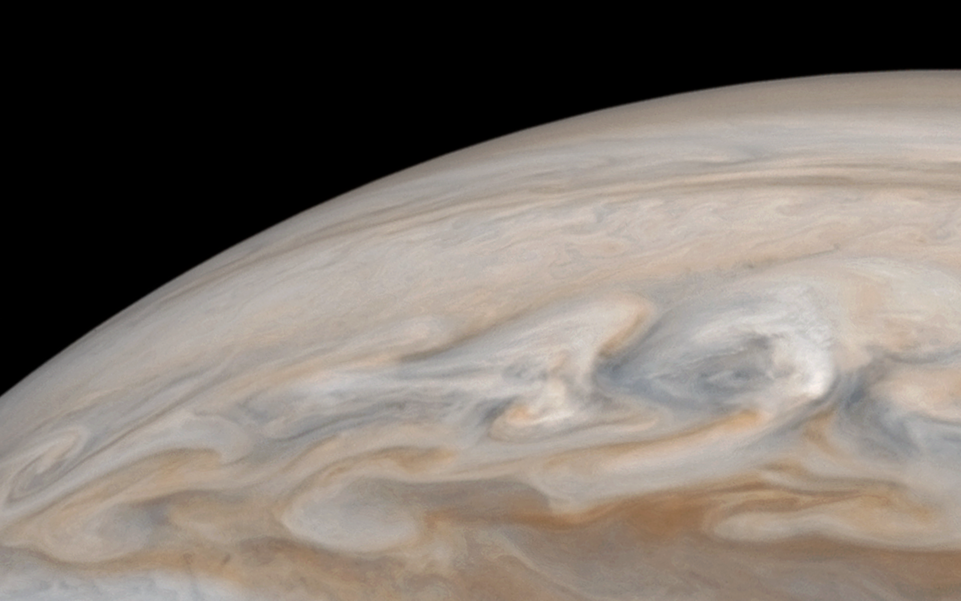 Enlarged and sharpened crop of Perijove 18 image #41 capturing a region of turbulence within the South Equatorial Belt. This image captures several strong anticyclonic systems located along the jet stream that forms the southern boundary of the South Equatorial Belt.