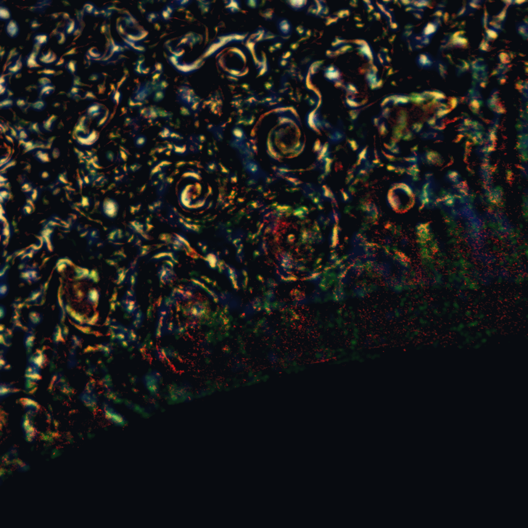 Each of the 20 frames of the animation is a weighted mean of two images, each of which is stacked from three heavily processed equidistant azimuthal south polar maps. The image noise level varying with color was considered. The animation is based on a set of ten raw JunoCam images taken during Juno's Perijove-18 flyby.