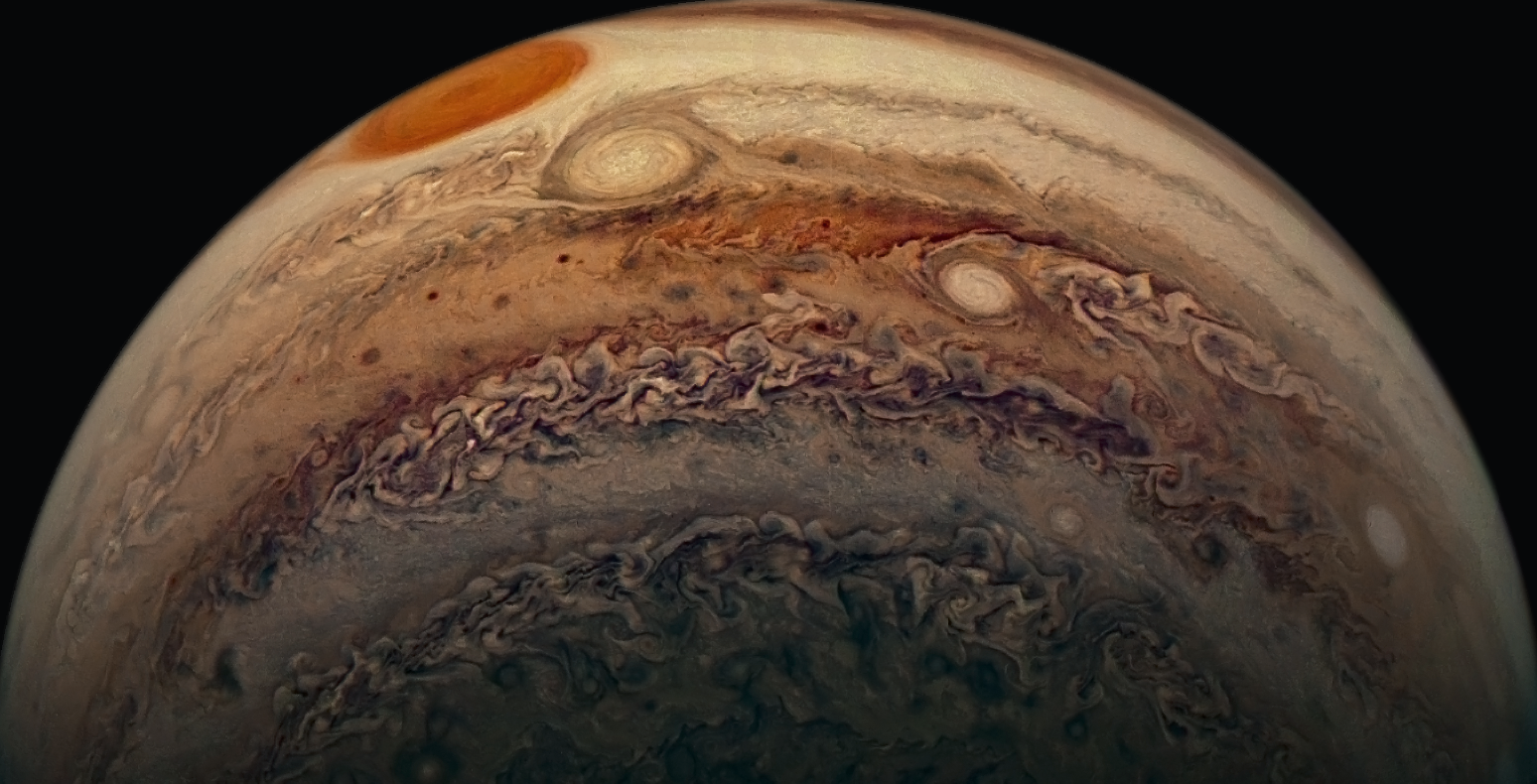 Processed using the JunoCam imager's PJ17 Southern Polar Region Coverage raw images and data from NASA's Juno spacecraft flyby on December 21, 2018. Enhanced to showcase the Great Red Spot, beautiful details, and colourful swirling clouds of Jupiter. Artist's impression - not representative of true colour.