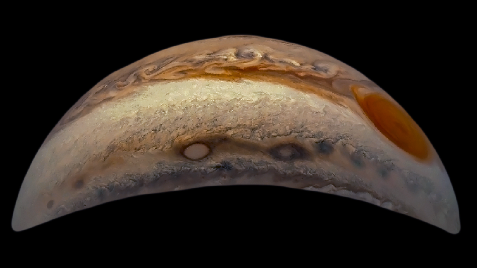 Processed using the JunoCam imager's PJ18 Great Red Spot Outbound raw images and data from February 12, 2019. Enhanced to showcase the Great Red Spot, beautiful details, and colourful swirling clouds of Jupiter. Artist's impression - not representative of true colour.