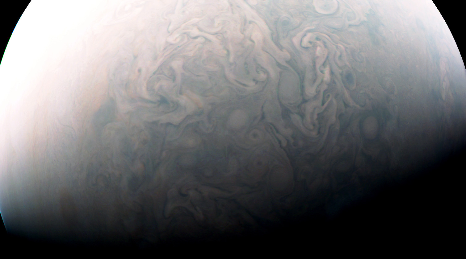 Juno's raw images were transformed, equalized and normalized, then - composed as RGB image. Resulting picture was also insignificantly tuned (contrast, sharping, color correction). Software used: GIMP 2.8.3. Raw image source: https://www.missionjuno.swri.edu/junocam/processing?id=627