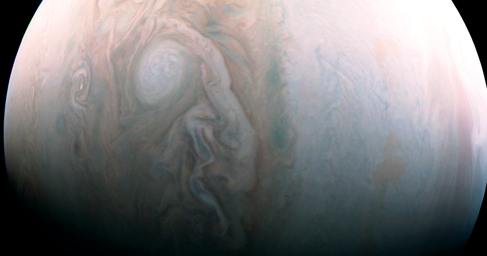 Juno's raw images were transformed, equalized and normalized, then - composed as RGB image. Resulting picture was also insignificantly tuned (contrast, sharping, color correction). Software used: GIMP 2.8.3. Raw image source: https://www.missionjuno.swri.edu/junocam/processing?id=633