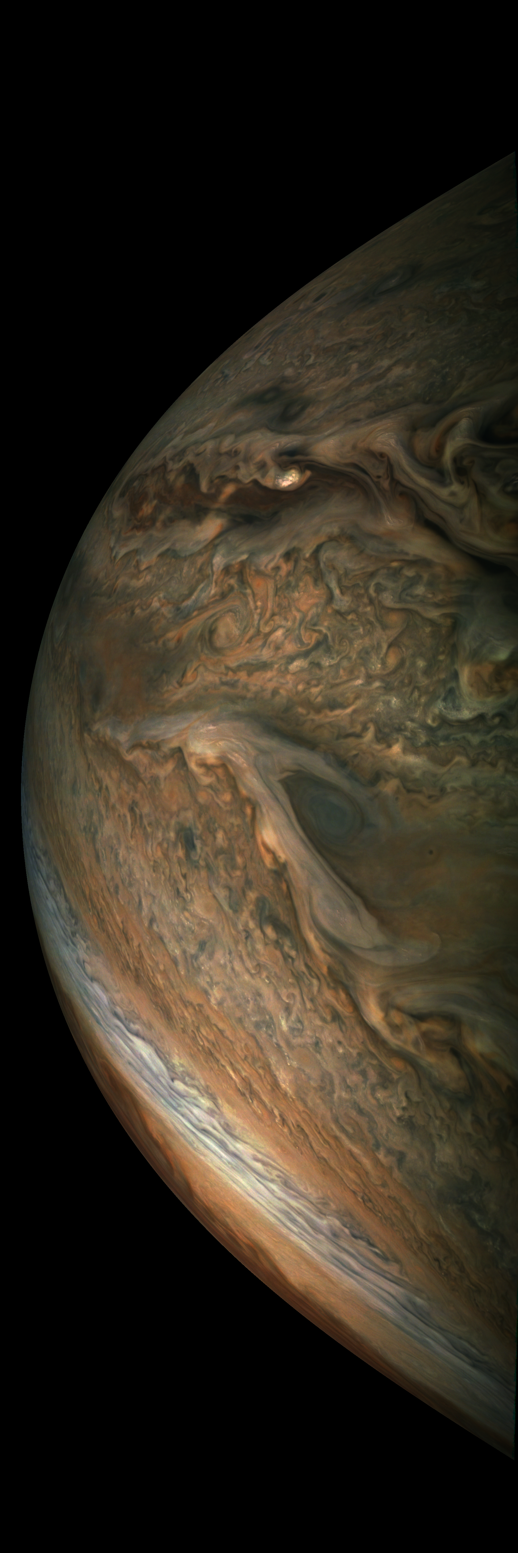 Junocam pixels are 12 bits deep from the camera but are converted to 8 bits inside the instrument using a lossless "companding" table, a process similar to gamma correction, to reduce their size. All Junocam products on the missionjuno website are in this 8-bit form as received on Earth. Scientific users interested in radiometric analysis should use the "RDR" data products archived with the Planetary Data System, which have been converted back to a linear 12-bit scale.