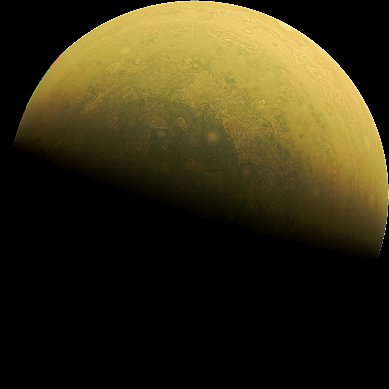 Junocam pixels are 12 bits deep from the camera but are converted to 8 bits inside the instrument using a lossless "companding" table, a process similar to gamma correction, to reduce their size. All Junocam products on the missionjuno website are in this 8-bit form as received on Earth. Scientific users interested in radiometric analysis should use the "RDR" data products archived with the Planetary Data System, which have been converted back to a linear 12-bit scale.