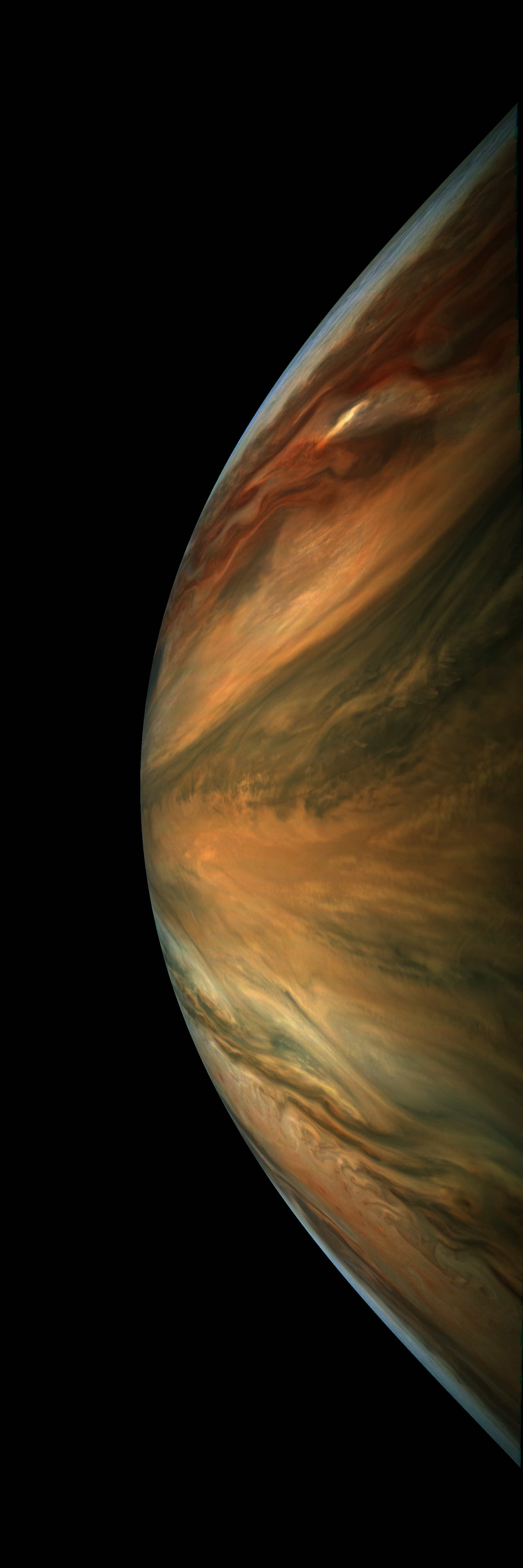 Resolution is 30 pixels per degrees in an equidistant cylindrical system centered to the camera at image stop time, with an axis parallel to Juno's spin axis. The rendered field of view is 60x180 degrees.