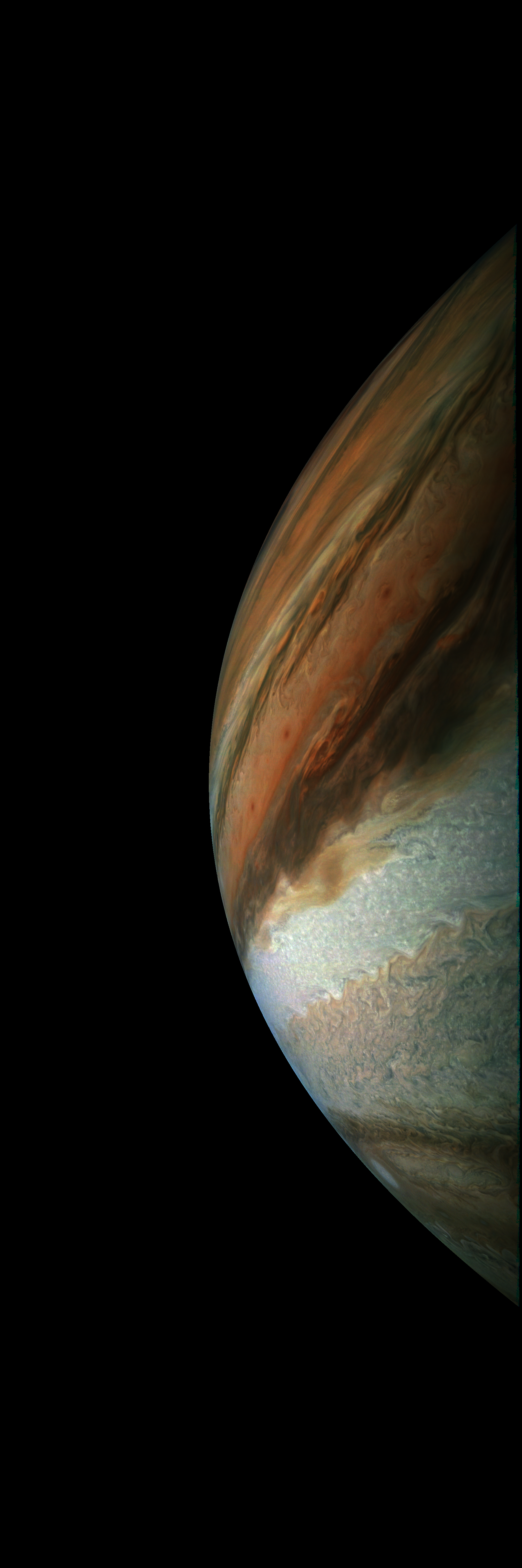 Resolution is 30 pixels per degrees in an equidistant cylindrical system centered to the camera at image stop time, with an axis parallel to Juno's spin axis. The rendered field of view is 60x180 degrees.