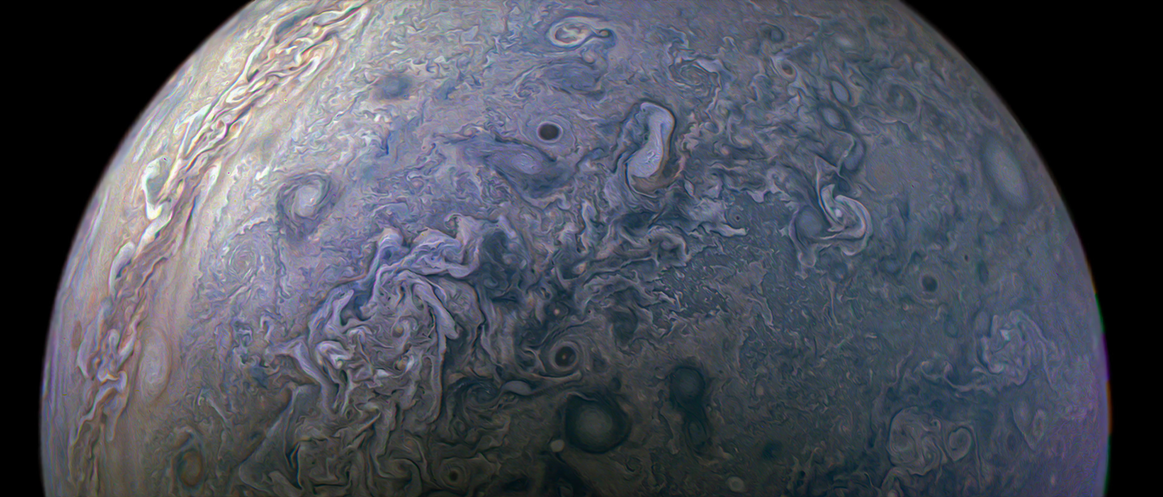 Junocam pixels are 12 bits deep from the camera but are converted to 8 bits inside the instrument using a lossless "companding" table, a process similar to gamma correction, to reduce their size. All Junocam products on the missionjuno website are in this 8-bit form as received on Earth. Scientific users interested in radiometric analysis should use the "RDR" data products archived with the Planetary Data System, which have been converted back to a linear 12-bit scale.