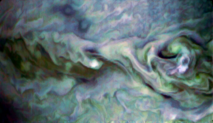 Junocam pixels are 12 bits deep from the camera but are converted to 8 bits inside the instrument using a lossless "companding" table, a process similar to gamma correction, to reduce their size. All Junocam products on the missionjuno website are in this 8-bit form as received on Earth. Scientific users interested in radiometric analysis should use the "RDR" data products archived with the Planetary Data System, which have been converted back to a linear 12-bit scale.