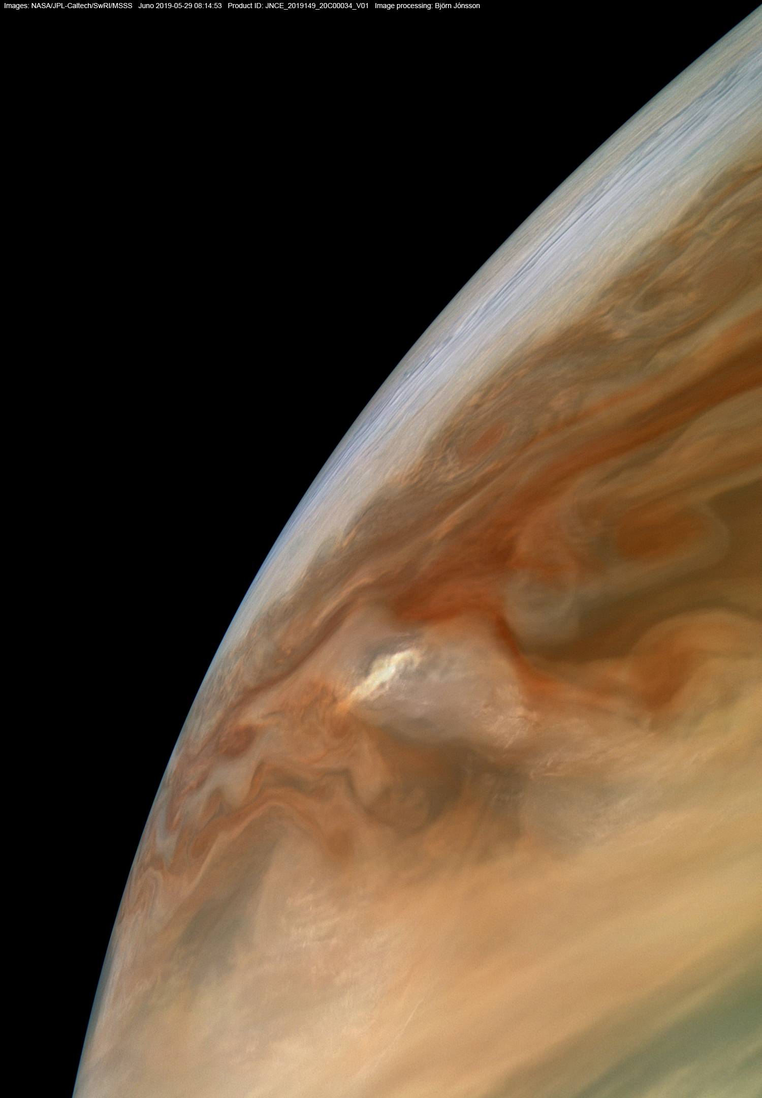 An image processed from the PJ20_34 raw image framelets. The contrast has been increased and color differences enhanced. Special care was taken not to 'saturate' the very bright cloud below center. To bring out some details in the cloud it was also processed differently from other parts of the image.