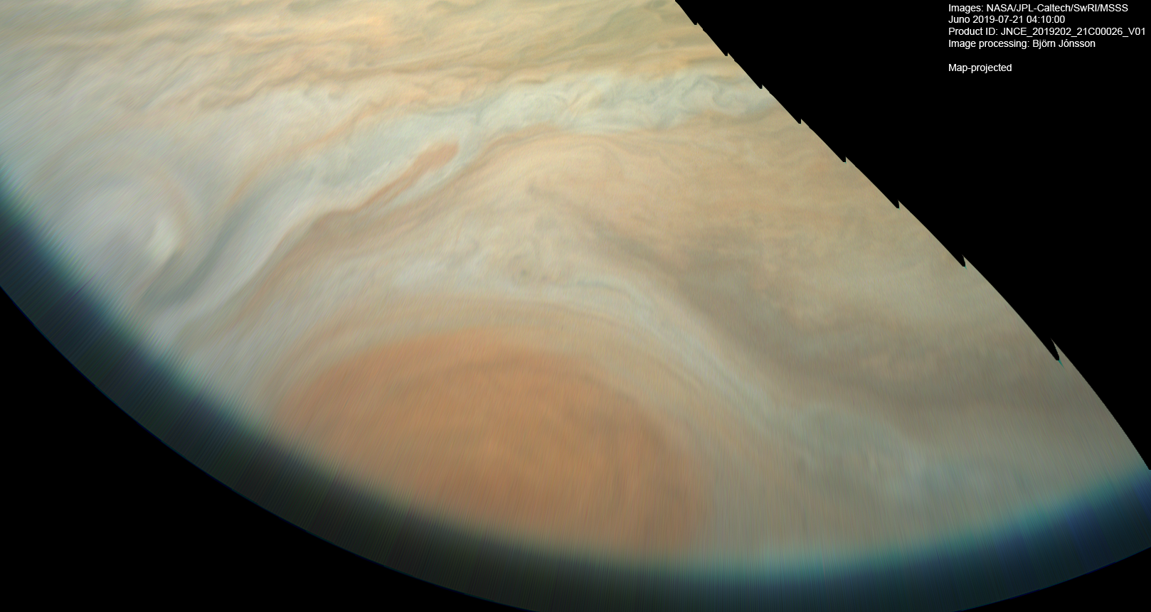 This is a preliminary map-projected version of image PJ21_26. The Great Red Spot in on the limb in the original raw image, therefore a part of it is 'missing' here. Jupiter's sky is also visible with huge vertical exaggeration. Approximately true color/contrast.