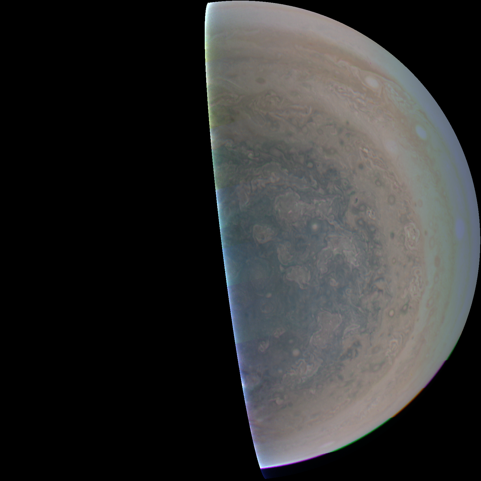 Junocam pixels are 12 bits deep from the camera but are converted to 8 bits inside the instrument using a lossless "companding" table, a process similar to gamma correction, to reduce their size. All Junocam products on the missionjuno website are in this 8-bit form as received on Earth. Scientific users interested in radiometric analysis should use the "RDR" data products archived with the Planetary Data System, which have been converted back to a linear 12-bit scale.