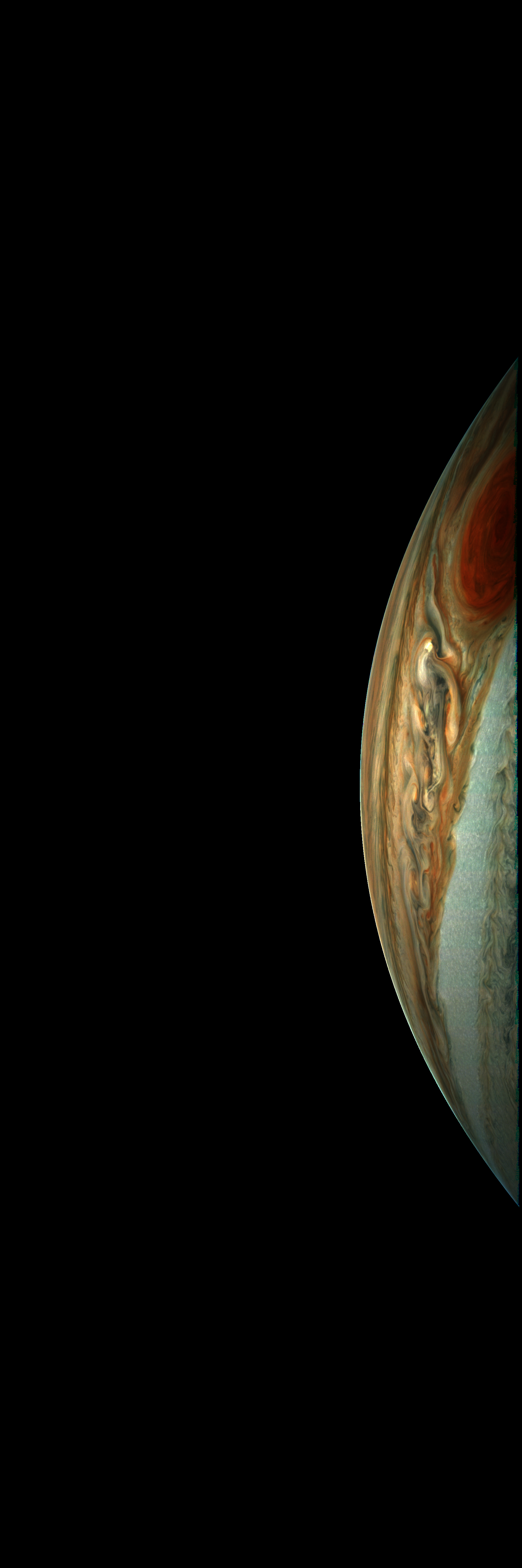 Junocam pixels are 12 bits deep from the camera but are converted to 8 bits inside the instrument using a lossless "companding" table, a process similar to gamma correction, to reduce their size. All Junocam products on the missionjuno website are in this 8-bit form as received on Earth. Scientific users interested in radiometric analysis should use the "RDR" data products archived with the Planetary Data System, which have been converted back to a linear 12-bit scale.