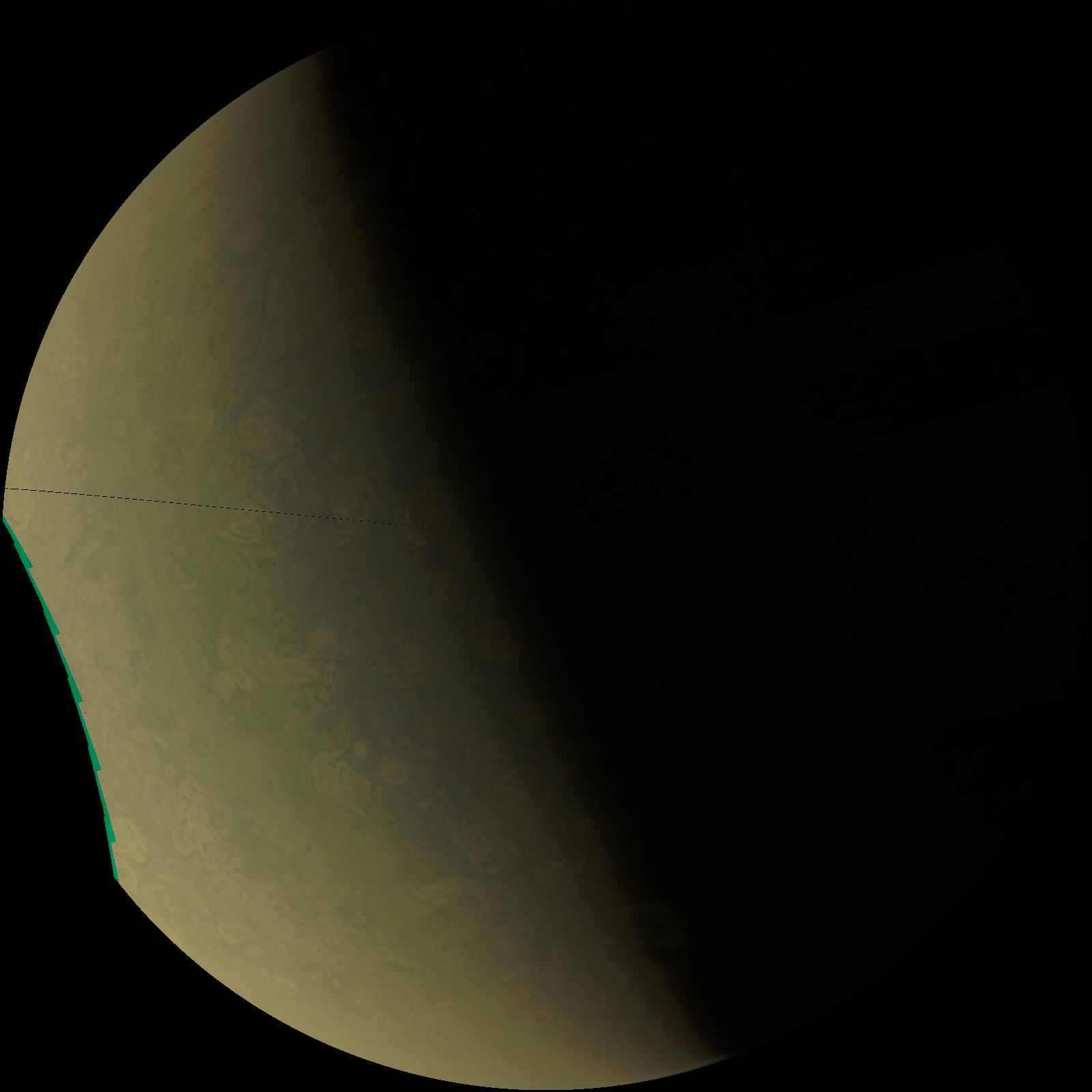 Junocam pixels are 12 bits deep from the camera but are converted to 8 bits inside the instrument using a lossless "companding" table, a process similar to gamma correction, to reduce their size. All Junocam products on the missionjuno website are in this 8-bit form as received on Earth. Scientific users interested in radiometric analysis should use the "RDR" data products archived with the Planetary Data System, which have been converted back to a linear 12-bit scale.