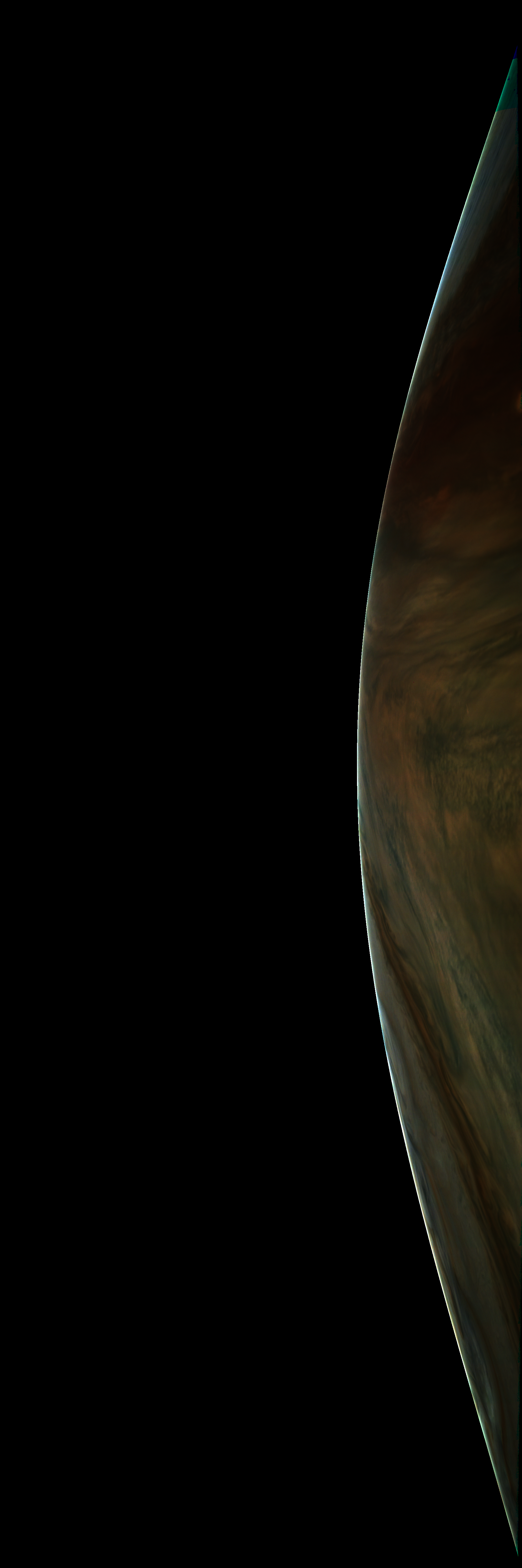 Resolution is 30 pixels per degrees in an equidistant cylindrical system centered to the camera at image stop time, with an axis parallel to Juno's spin axis. The rendered field of view is 60x180 degrees.