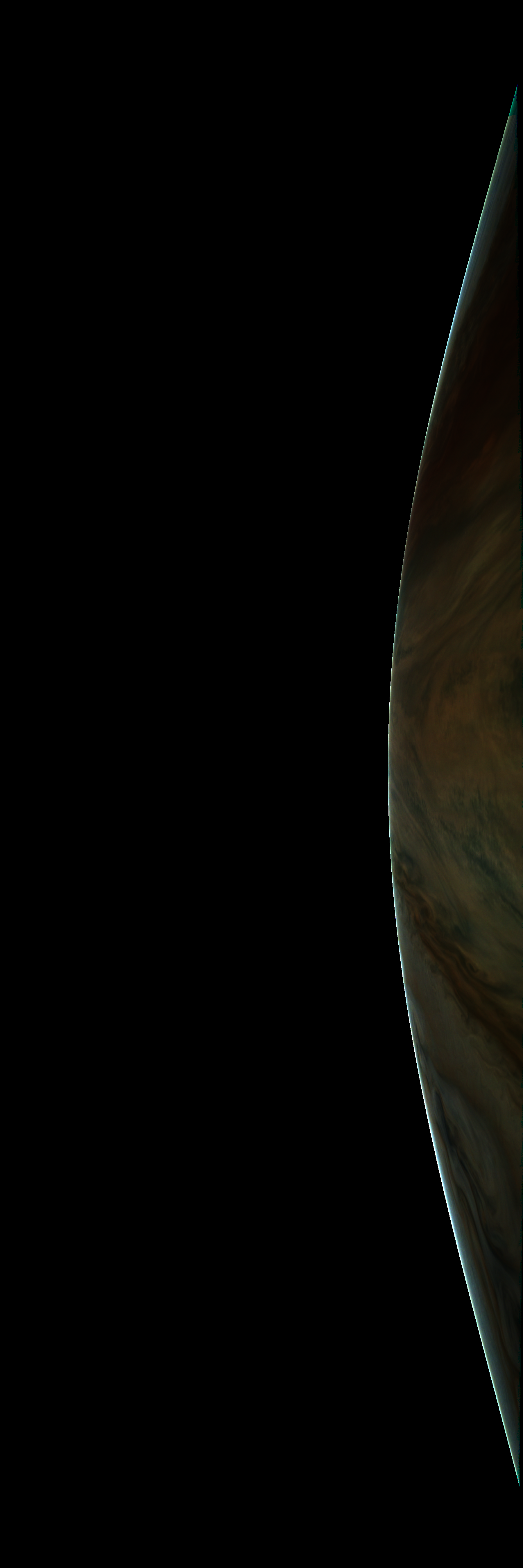 Resolution is 30 pixels per degrees in an equidistant cylindrical system centered to the camera at image stop time, with an axis parallel to Juno's spin axis. The rendered field of view is 60x180 degrees.