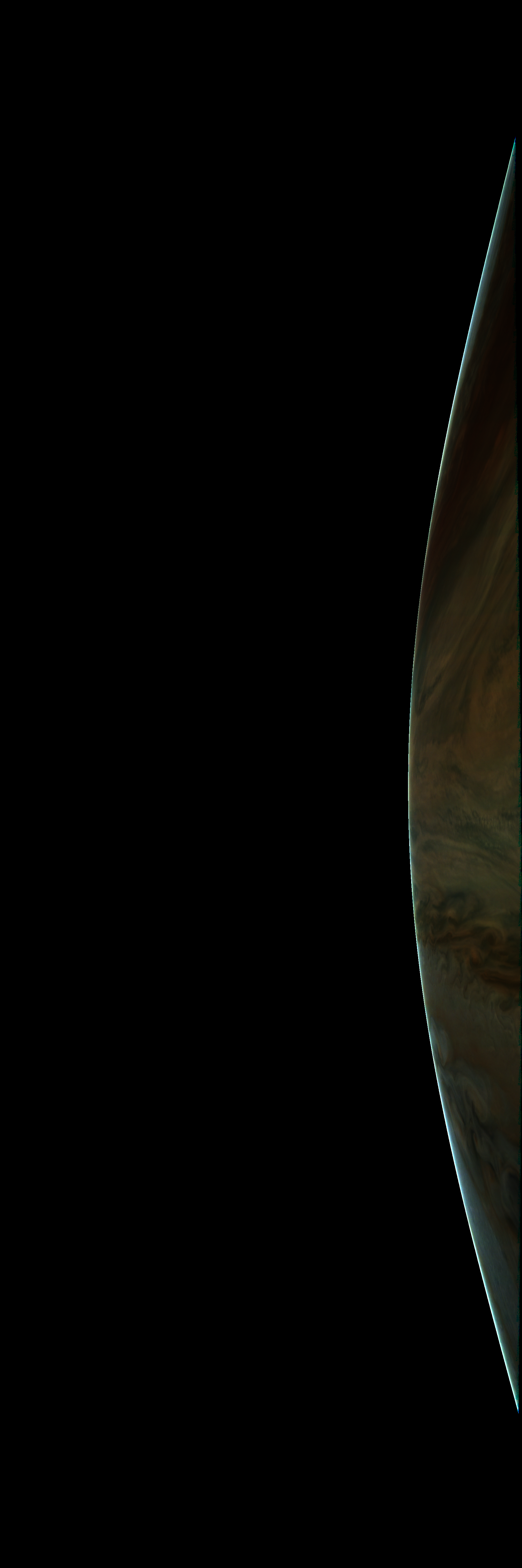 Resolution is 30 pixels per degrees in an equidistant cylindrical system centered to the camera at image stop time, with an axis parallel to Juno's spin axis. The rendered field of view is 60x180 degrees.
