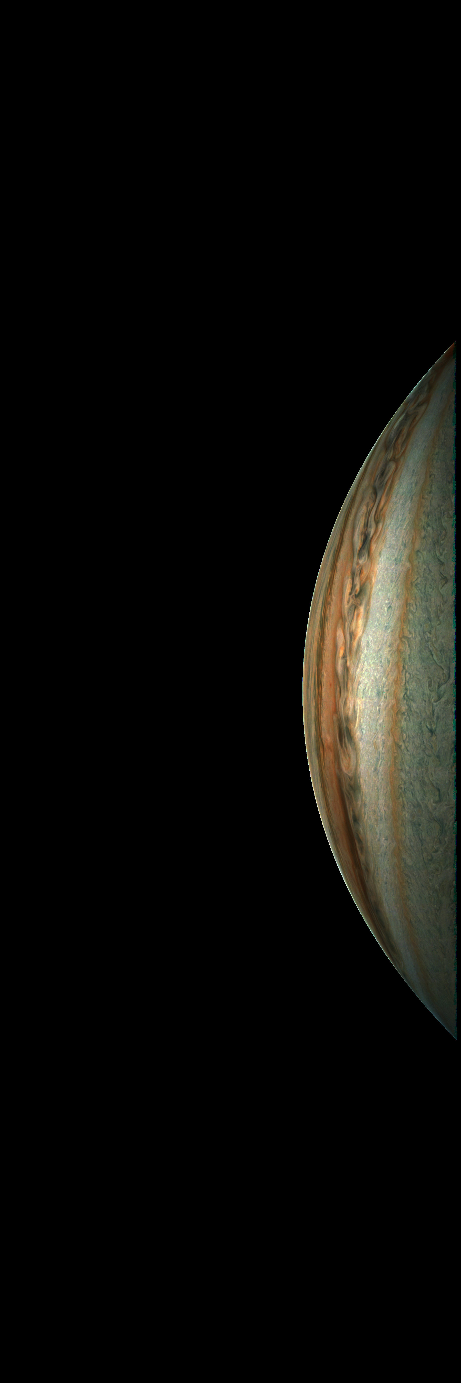 Resolution is 30 pixels per degrees in an equidistant cylindrical system centered to the camera at image stop time, with an axis parallel to Juno's spin axis. The rendered field of view is 60x180 degrees.