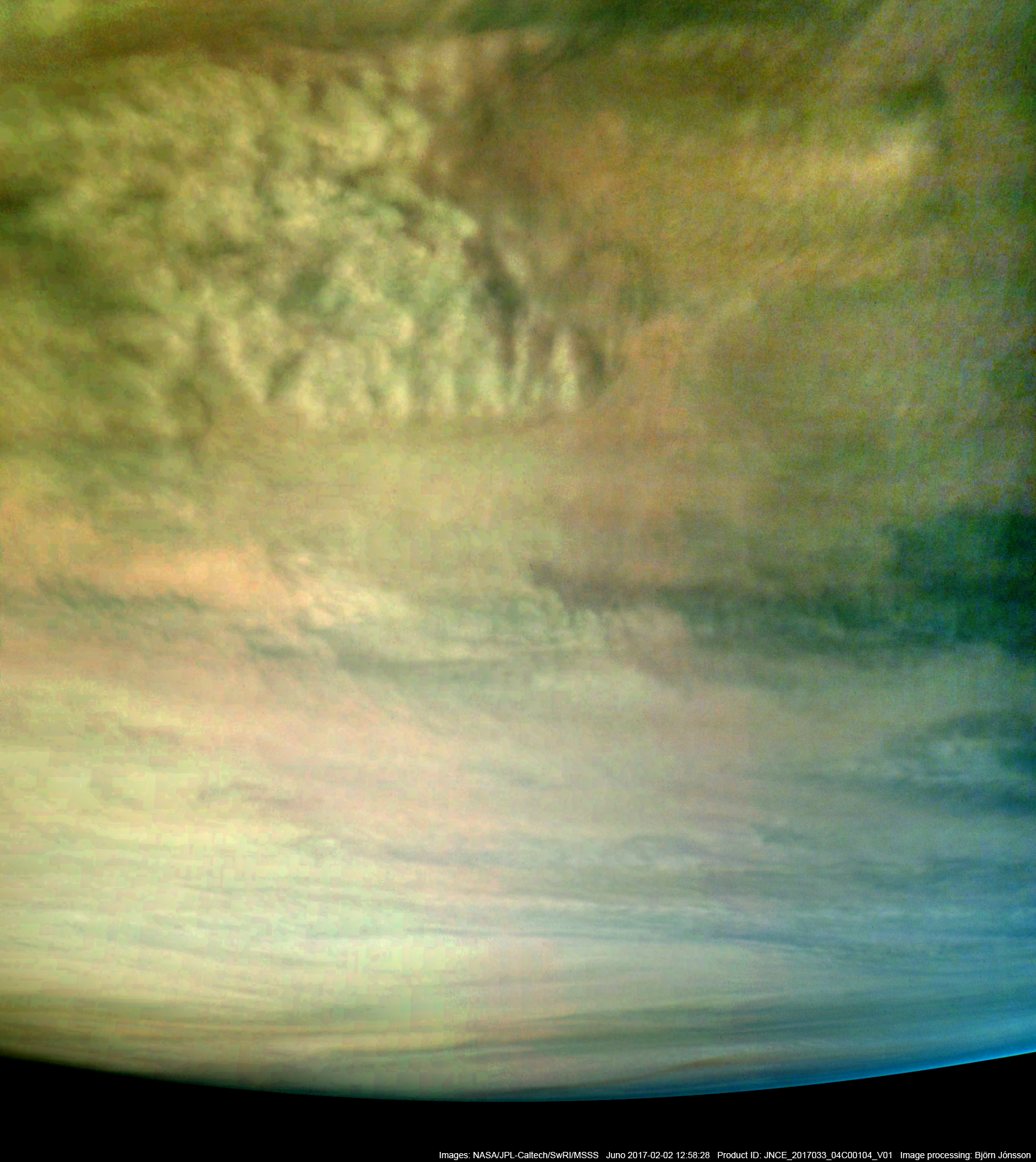 An image processed from the raw PJ4_104 image framelets. The contrast and color has been greatly exaggerated; the contrast was relatively low in the original image data. The processing parameters (for example amount of contrast stretch) differ for different parts of the image depending on the brightness and contrast of the original image data.