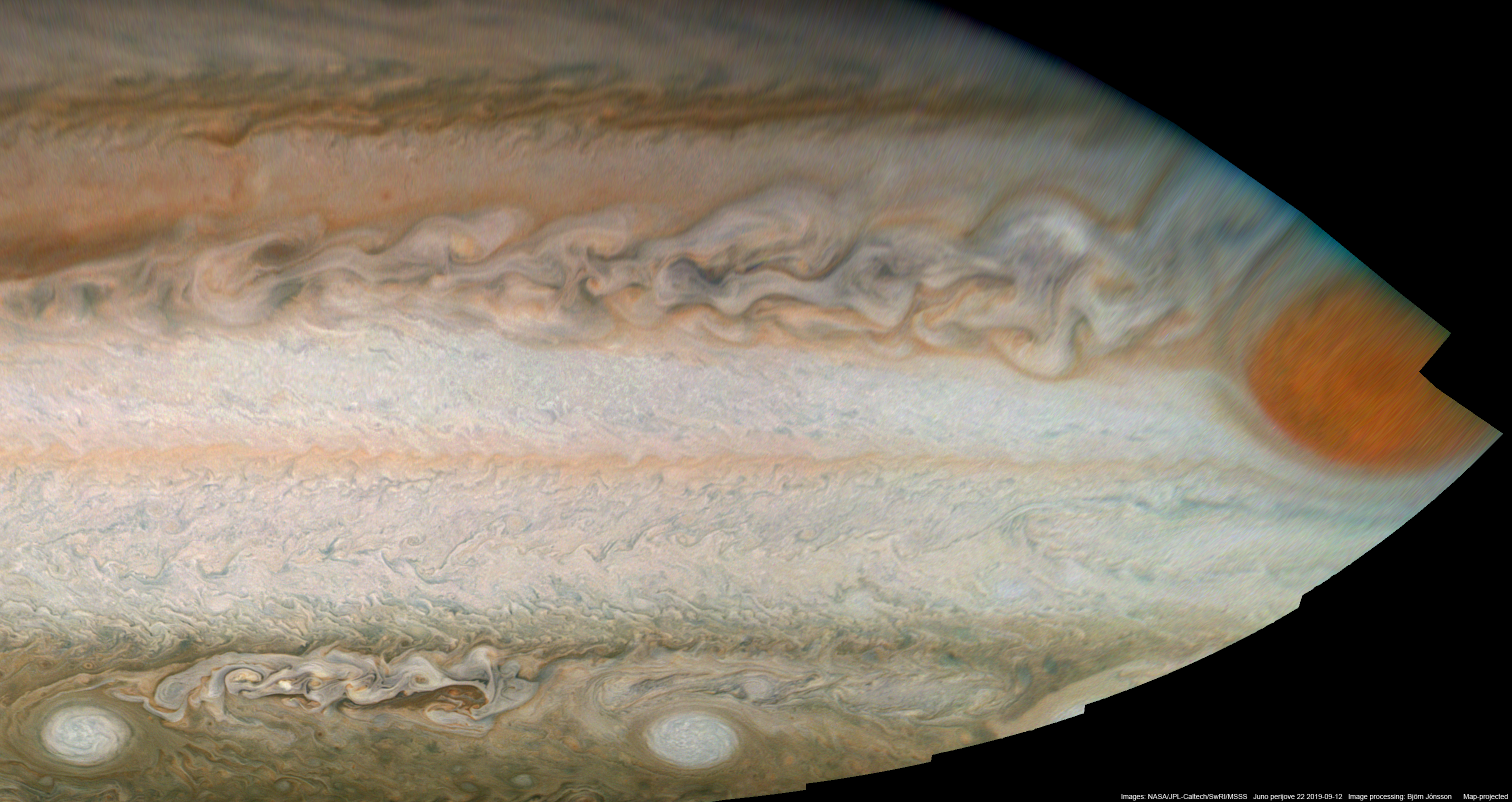 An enhanced map-projected mosaic of PJ22 images 42 and 43 showing the convective area west of the Great Red Spot (GRS). The GRS was at the limb in the original images. Therefore it is only partially visible here and also the areas near it appear fuzzy. Despite this relatively unfavorable viewing geometry, considerable details are visible in the convective area west of the GRS.