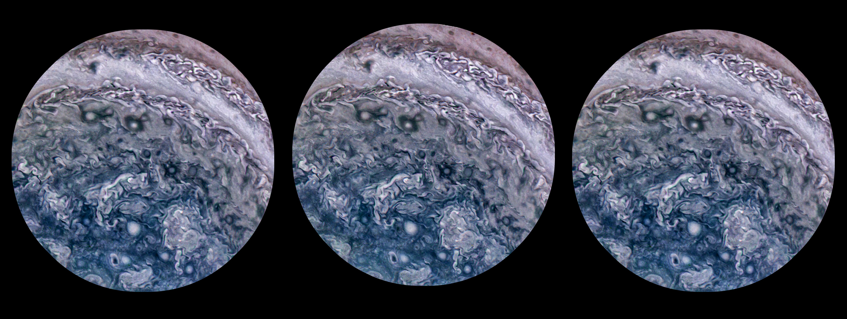 This is an actual stereograph, not an artificial 3D conversion made from a single 2D image. The 7-minute 5.3-second interval between two JunoCam images taken during the time lapse sequence of Perijove 17 (21 December 2018 at 18:07:11.483 and 18:14:16.748 UTC) established a stereo base (camera separation) of thousands of kilometers, from which this stereographic image pair was crafted using Photoshop. Thanks to the velocity of Juno, the distance traveled during the interval between these two captures effectively gives our eyes that same separation. Viewing Jupiter at a known average altitude of 103,733.7 km (64,457.1 miles), it's nevertheless possible to perceive features of the atmosphere three dimensionally. Juno's actual speed and, thus, the stereo base for this image pair from Perijove 17, is unknown (at least to the creator of this stereograph). Note that during the 7-minute 5.3-second interval, Juno ascended 12,113 km (7526.7 miles), from 97,677.2 km to 109,790.2 km (a 12.4% gain in altitude), requiring z-axis correction in addition to x- and y-axis skewing, to produce the stereograph.