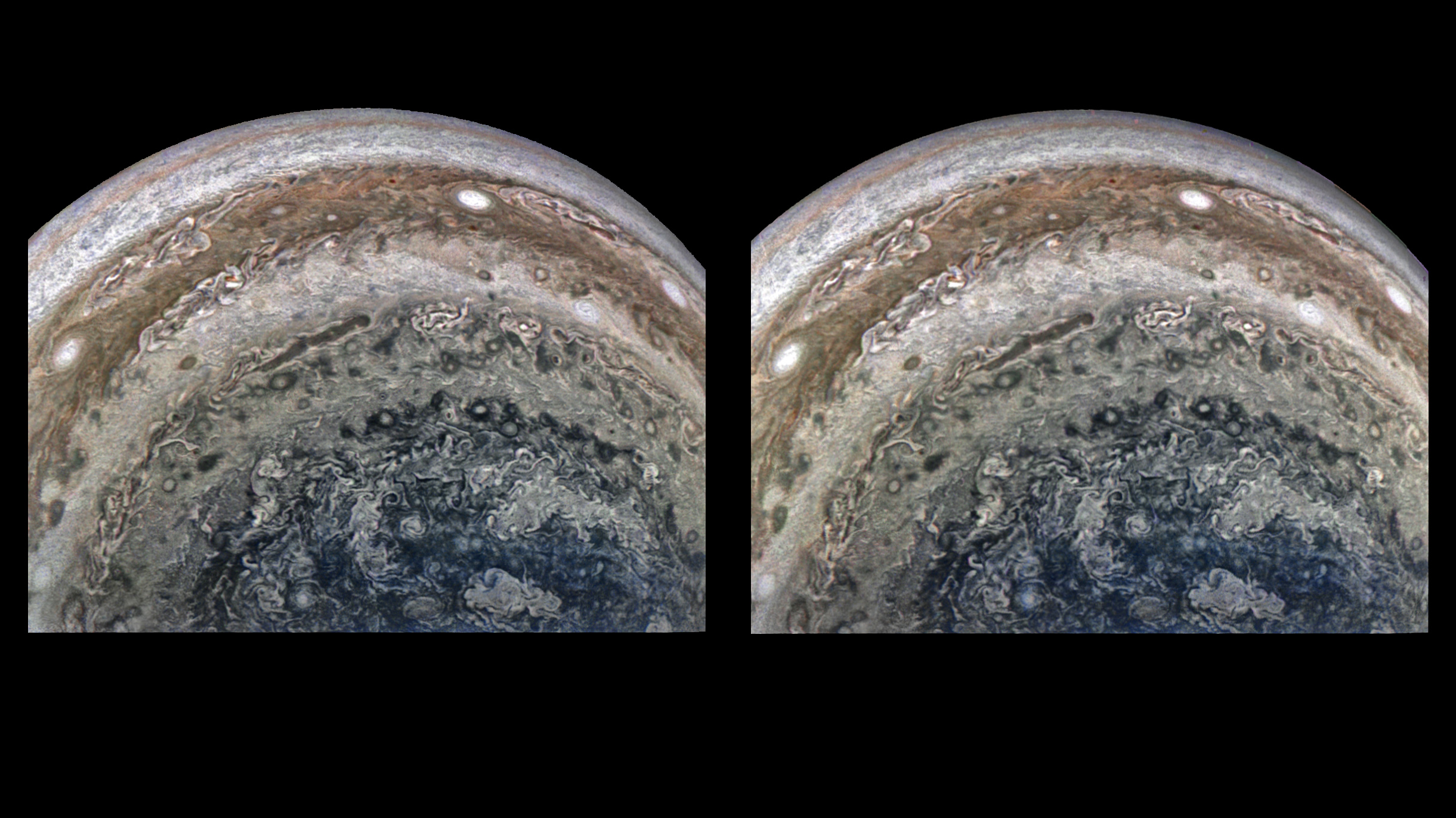 This is an actual stereograph, not an artificial 3D conversion made from a single 2D image. The 7 minutes 1.3 second interval between two JunoCam images taken during the time lapse sequence of Perijove 22 (12 September 2019 at 04:57:58.434 and 05:04:59.710 UTC) established a stereo base (camera separation) of thousands of kilometers, from which this stereographic image pair was crafted using Photoshop. Thanks to the velocity of Juno, the distance traveled during the interval between these two captures effectively gives our eyes that same separation. Viewing Jupiter at a known average altitude of 120,678.1 km (74,985.9 miles), it's nevertheless possible to perceive features of the atmosphere three dimensionally. Juno's actual speed and, thus, the stereo base for this image pair from Perijove 22, is unknown (at least to the creator of this stereograph). Note that during the 7 minutes 1.3 second interval, Juno ascended 11,680.2 km (7257.7 miles), from 114,838.0 km to 126,518.2 km (a 10.17% gain in altitude), requiring z-axis correction in addition to x- and y-axis skewing, to produce the stereograph. Also: Dissimilar but radially thin slivers of the horizon were trimmed from both of the source images to eliminate uncorrectable retinal rivalry seen when fusing the image pair and to exclude some RGB artifacts that can be seen at the horizon in the original images.