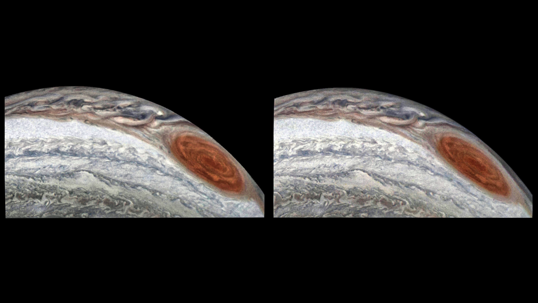 This is an actual stereograph, not an artificial 3D conversion made from a single 2D image. The 5-minute 0.8-second interval between two JunoCam images taken during the time lapse sequence of Perijove 21 (21 July 2019 at 04:42:29.390 and 04:47:30.202 UTC) established a stereo base (camera separation) of thousands of kilometers, from which this stereographic image pair was crafted using Photoshop. Thanks to the velocity of Juno, the distance traveled during the interval between these two captures effectively gives our eyes that same separation. Viewing Jupiter at a known average altitude of 55,478.7 km (34,472.8 miles), it's nevertheless possible to perceive features of the atmosphere three dimensionally. Juno's actual speed and, thus, the stereo base for this image pair from Perijove 21, is unknown (at least to the creator of this stereograph). Note that during the 5-minute 0.8-second interval, Juno ascended 8,458.4 km (5,255.8 miles), from 51,249.5 km to 59,707.9 km (a 16.5% gain in altitude), requiring z-axis correction in addition to x- and y-axis skewing, to produce the stereograph.