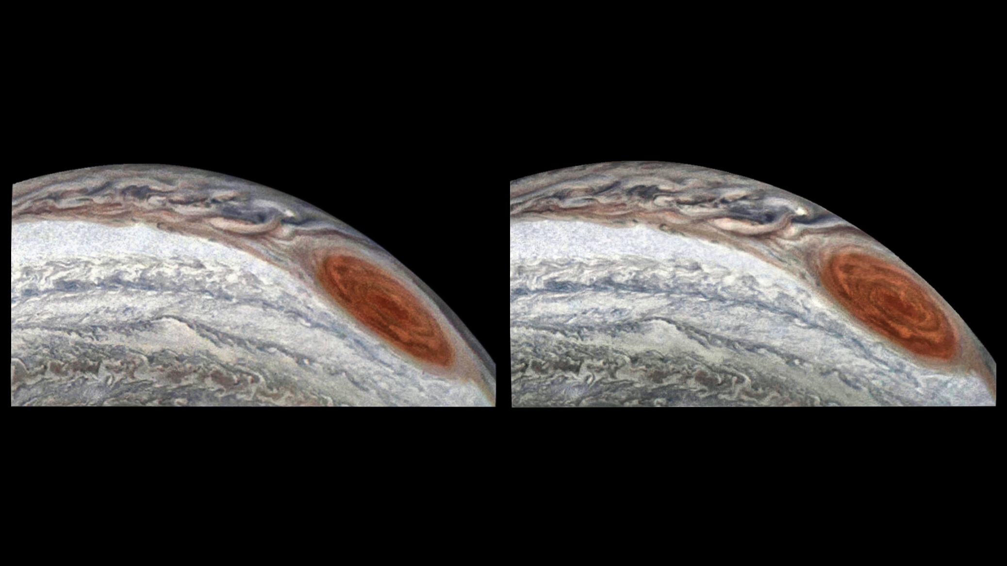 This is an actual stereograph, not an artificial 3D conversion made from a single 2D image. The 5-minute 0.8-second interval between two JunoCam images taken during the time lapse sequence of Perijove 21 (21 July 2019 at 04:42:29.390 and 04:47:30.202 UTC) established a stereo base (camera separation) of thousands of kilometers, from which this stereographic image pair was crafted using Photoshop. Thanks to the velocity of Juno, the distance traveled during the interval between these two captures effectively gives our eyes that same separation. Viewing Jupiter at a known average altitude of 55,478.7 km (34,472.8 miles), it's nevertheless possible to perceive features of the atmosphere three dimensionally. Juno's actual speed and, thus, the stereo base for this image pair from Perijove 21, is unknown (at least to the creator of this stereograph). Note that during the 5-minute 0.8-second interval, Juno ascended 8,458.4 km (5,255.8 miles), from 51,249.5 km to 59,707.9 km (a 16.5% gain in altitude), requiring z-axis correction in addition to x- and y-axis skewing, to produce the stereograph.