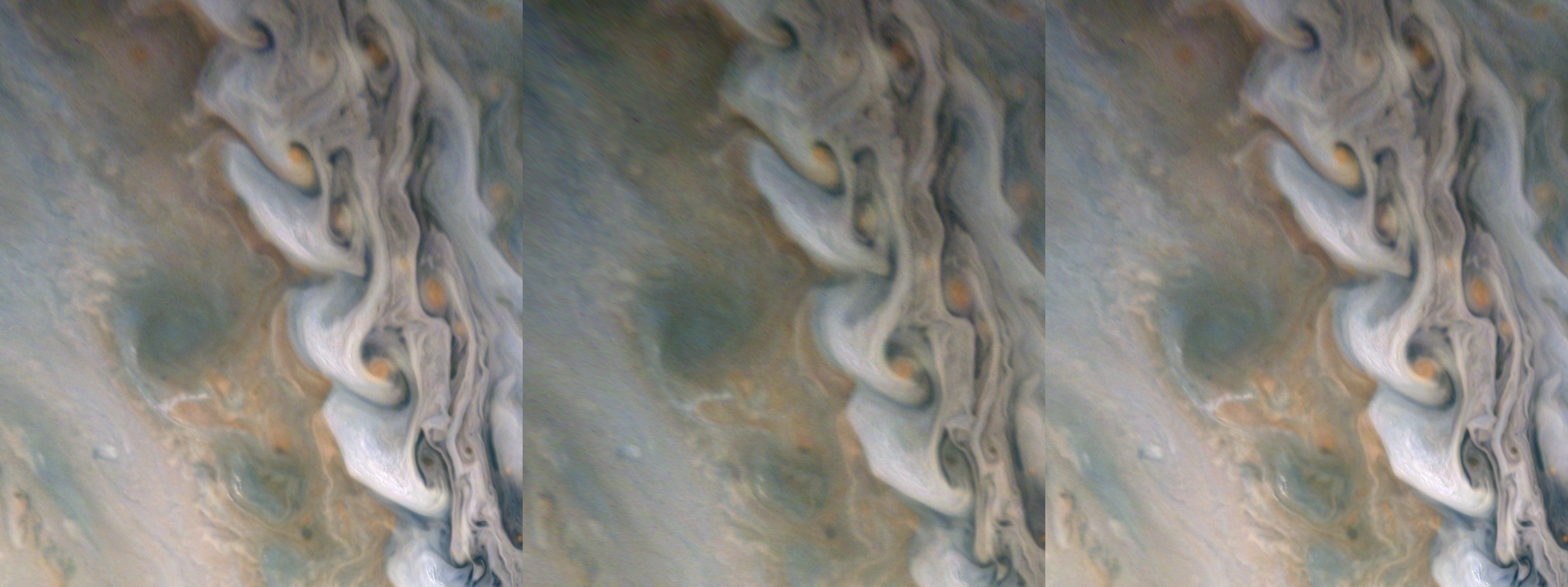 Junocam pixels are 12 bits deep from the camera but are converted to 8 bits inside the instrument using a lossless "companding" table, a process similar to gamma correction, to reduce their size. All Junocam products on the missionjuno website are in this 8-bit form as received on Earth. Scientific users interested in radiometric analysis should use the "RDR" data products archived with the Planetary Data System, which have been converted back to a linear 12-bit scale.