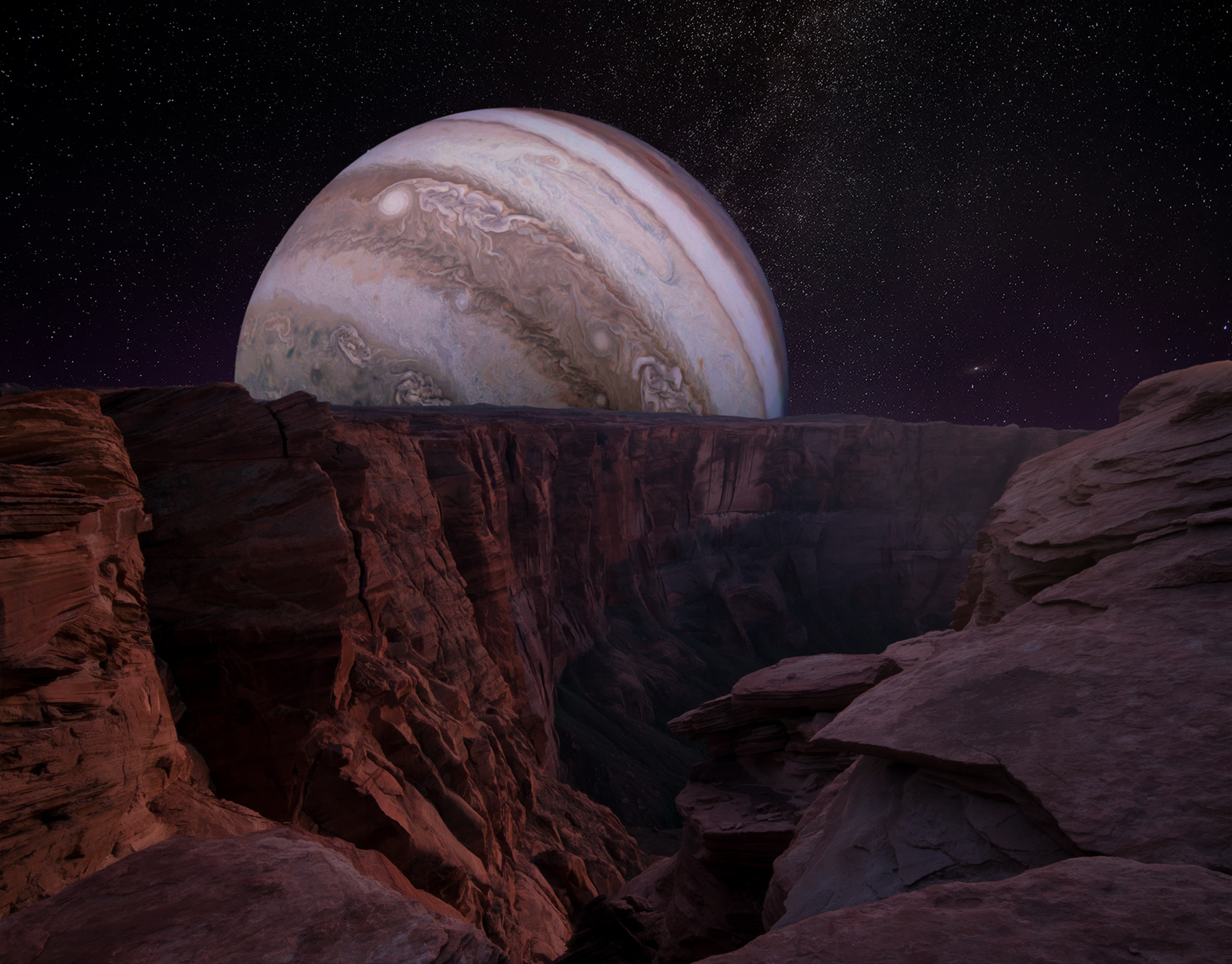 Jupiter has 79 moons, and Ganymede is one of them. Actually it's the largest moon in our solar system. This is what I envision what Jupiter would look like if you were standing at the edge of a precipice on Ganymede.