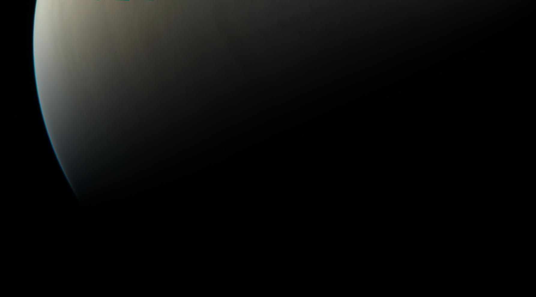We have a methane filter, included for the polar science investigation, that is almost at the limits of our detector’s wavelength range. To get enough photons for an image we need to use a very long exposure. In some images this results in scattered light in the image. For science purposes we will simply crop out the portions of the image that include this artifact. Work is in progress to determine exactly what conditions cause stray light problems so that this can be minimized for future imaging.