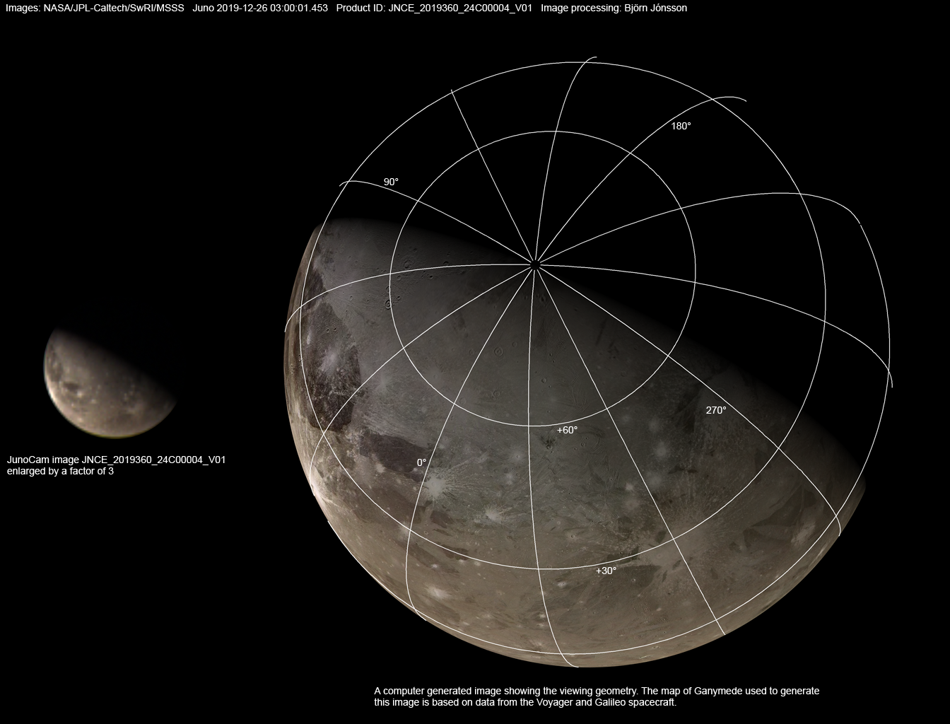 An approximately true color/contrast JunoCam image of Ganymede processed from the PJ24_4 raw image framelets and enlarged by a factor of 3 (left). The bigger image at right is computer generated and includes a latitude/longitude grid to show the viewing geometry; this synthetic image is generated using a map that is based on data from the Voyager and Galileo spacecraft.