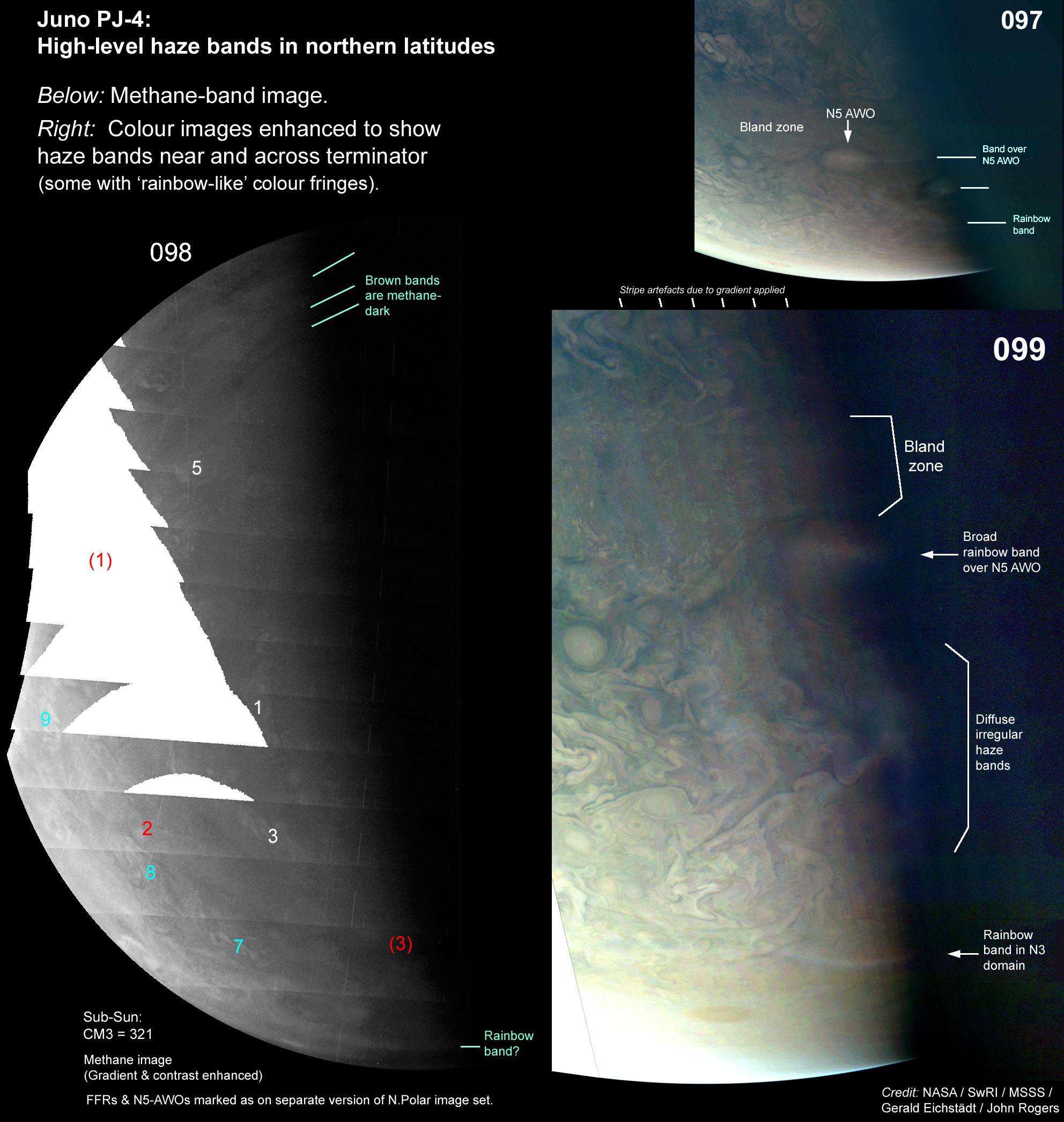 Here is a methane-band image (labelled as in the figure Annotations-2), and parts of colour images 097 and 099, enhanced to display the high-level haze bands near and over the terminator. Most curious are ‘rainbow bands’ of haze. There are 3 examples here, including one which lies over an anticyclonic white oval (AWO) in the N5 domain. From discussions with Gerald and with Mike Caplinger of the JunoCam team, possible artefacts include scattered light in the camera, and residual colour gradients across the image strips (as seen on the dark side; this might explain the blue fringe in some cases). But I am still not sure if these can explain all these 'rainbow bands'. --John Rogers.