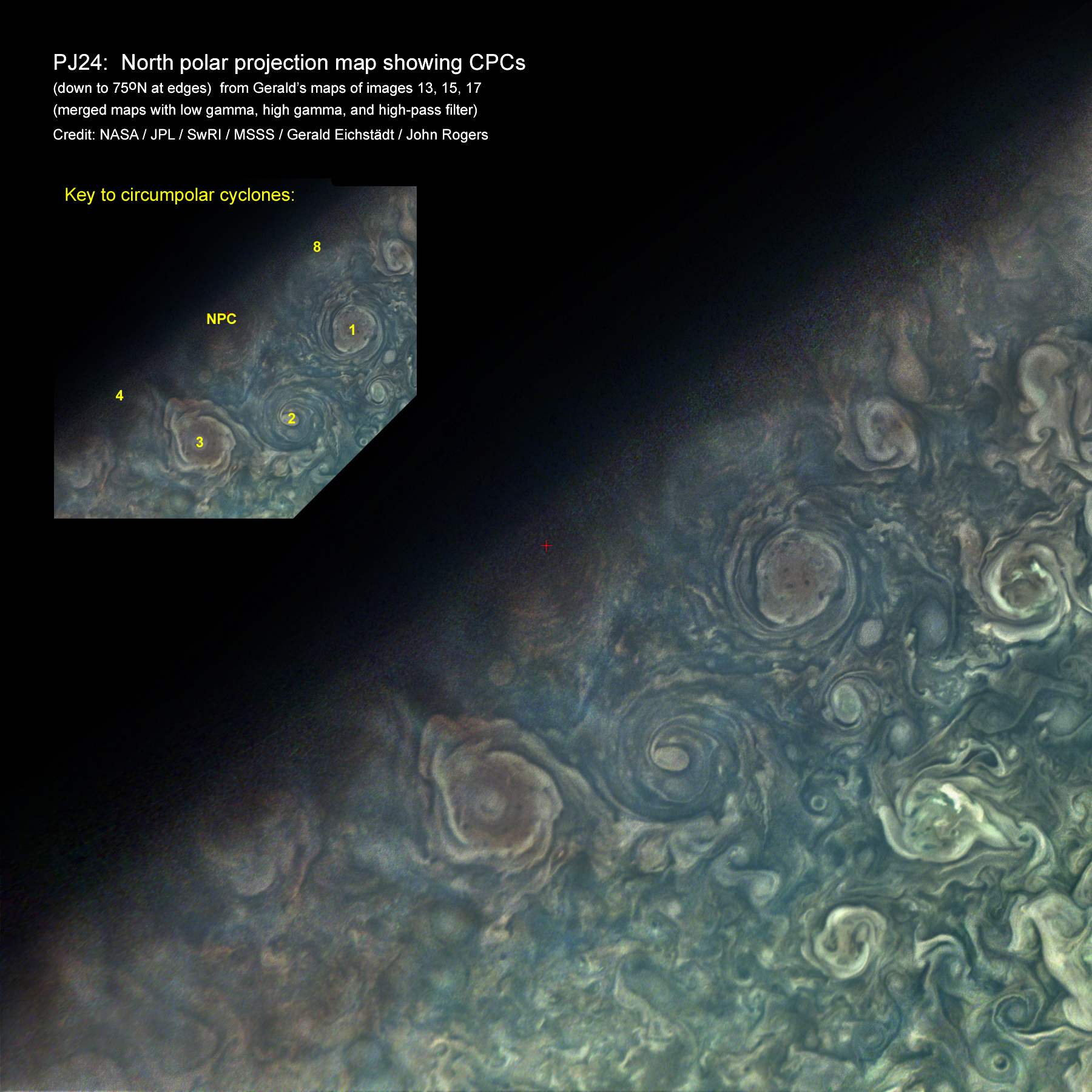 This is a composite of north polar projection maps produced by Gerald Eichstadt from images 13, 15 & 17. By enhancing the terminator and blending 3 maps, noise is much reduced and the reddish cloud ridges of the North Polar Cyclone stand out clearly. Three of the circumpolar cyclones are splendidly shown, and the edges of two others are just visible on the terminator. --John Rogers.
