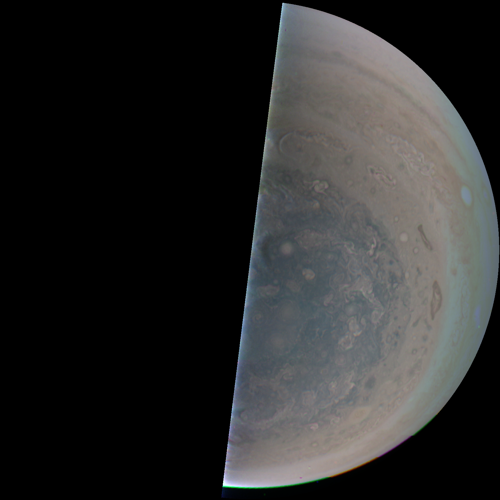 Junocam pixels are 12 bits deep from the camera but are converted to 8 bits inside the instrument using a lossless "companding" table, a process similar to gamma correction, to reduce their size. All Junocam products on the missionjuno website are in this 8-bit form as received on Earth. Scientific users interested in radiometric analysis should use the "RDR" data products archived with the Planetary Data System, which have been converted back to a linear 12-bit scale.