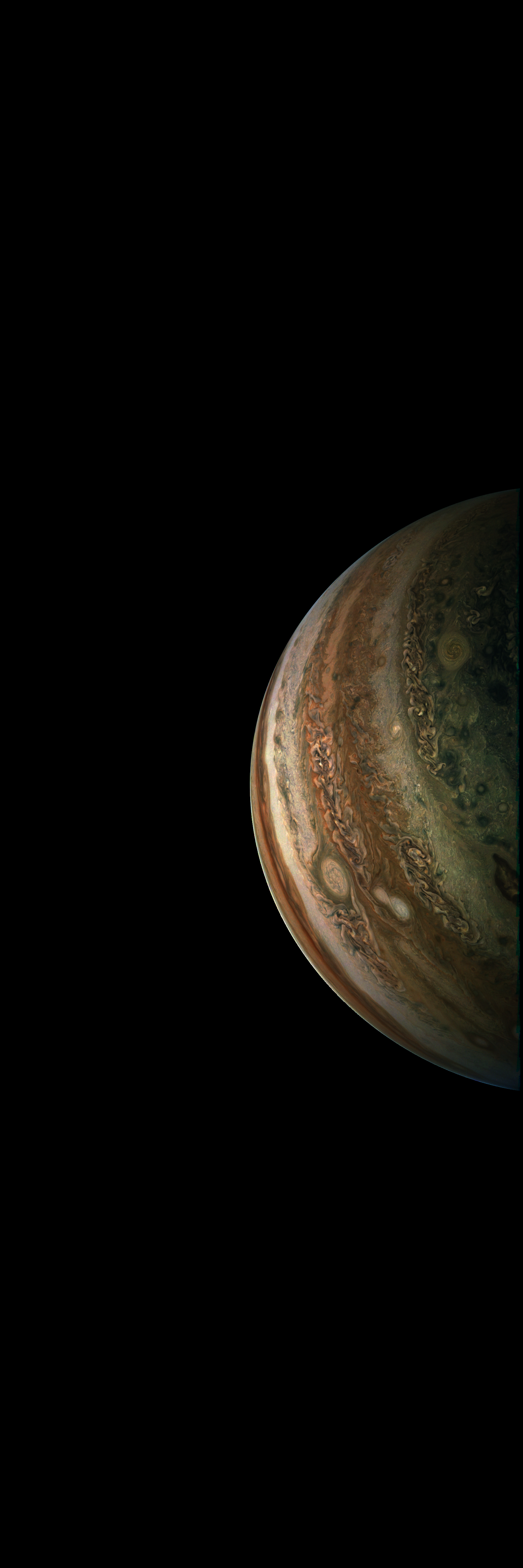 Resolution is 30 pixels per degrees in an equidistant cylindrical system centered to the camera at image stop time, with an axis parallel to Juno's spin axis. The rendered field of view is 60x180 degrees.